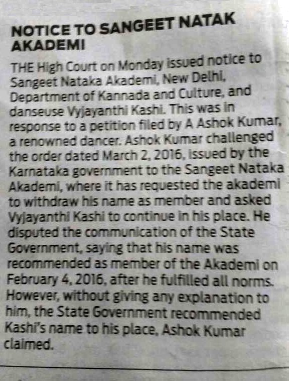 | Public notice to Sangeet Natak Akademi September 22, 2016 Announcement in The Indian Express dated Sept 21, 2016 about dispute regarding Karnataka nominee. ![]() Post your comments Pl provide your name and email id along with your comment. All appropriate comments posted with name and email id in the blog will also be featured in the site. |