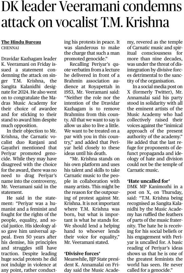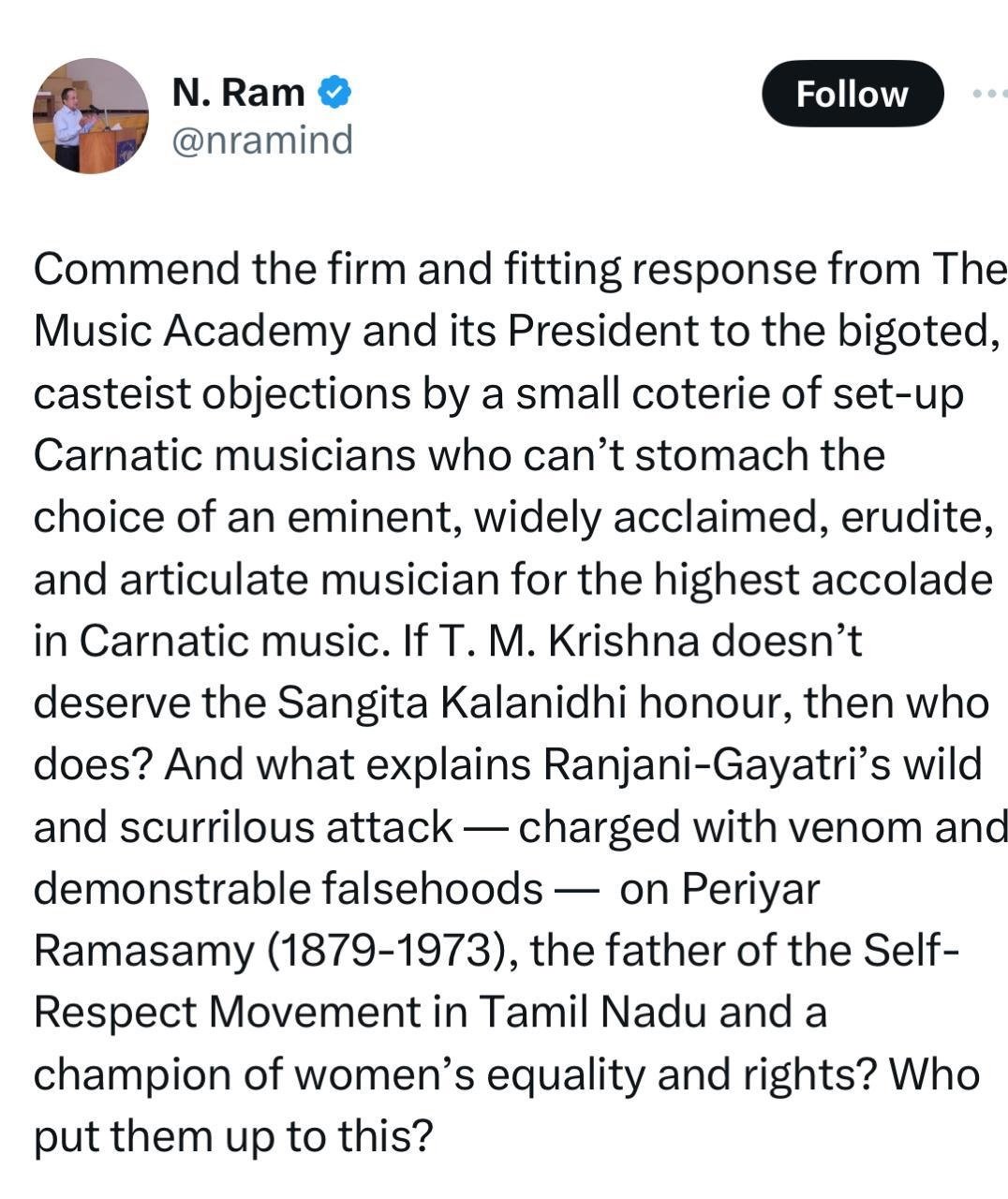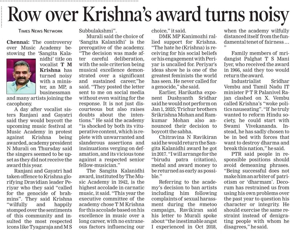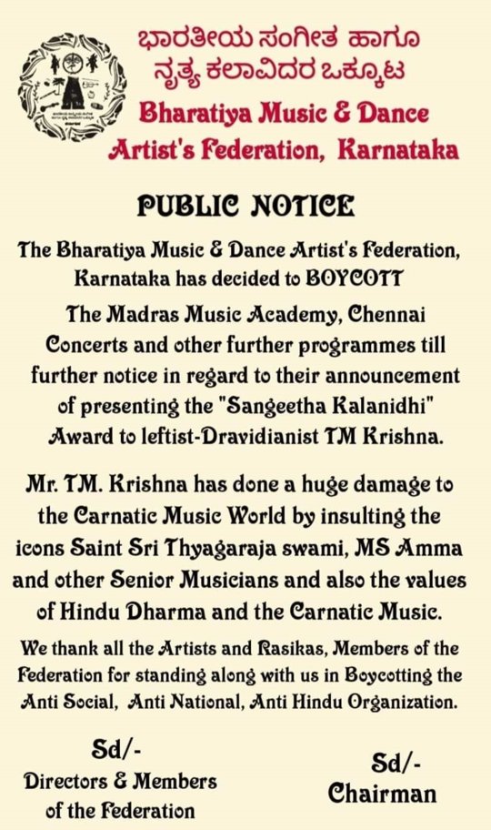 MUSIC ACADEMY - TM KRISHNA AWARD CONTROVERSY March 17, 2024 T M Krishna to get Sangita Kalanidhi award - M Ramesh Renowned Carnatic musician T M Krishna chosen for Sangita Kalanidhi award; known for music and social activism March 18, 2024 Intellectual honesty demands that T M Krishna decline the Sangita Kalanidhi Award - K Balakumar March 19, 2024 You have a responsibility to your art, to ask difficult questions - Asha Prakash March 20, 2024 Dushyant Sridhar March 20, 2024 Ranjani Gayatri to Madras Music Academy March 18, 2024 Chitravina Ravikiran Vishaka Hari N Ram Krithika Sivaswamy Krishna Shastri Devulapalli Ricky Kej S Gurumurthy March 21, 2024 Madras Music Academy to Ranjani & Gayatri March 21, 2024 Palghat Ramprasad March 21, 2024 Trichur Brothers March 21, 2024 Madras Music Academy has given the Sangita Kalanidhi to a Hindu-hating Far Left activist, not to a Carnatic musician - Vaijayanthi March 21, 2024 Music Academy hits back as Carnatic singer-sisters object to award for colleague - India Today Entertainment Desk The Music Academy, Madras, has responded to Carnatic musician duo Ranjani-Gayatri for their protest against TM Krishna. He was awarded Sangita Kalanidhi of 2024. March 21, 2024 TM Krishna's Sangita Kalanidhi controversy explained: Why some Carnatic musicians are opposing his honour - Latha Srinivasan March 21, 2024 Carnatic musicians Ranjani-Gayatri boycott conference after TM Krishna gets award - Arfa Javaid March 21, 2024 Brahmin meltdown over Madras Music Academy award to TM Krishna shows fear of change TM Krishna being conferred with Sangita Kalanidhi title has led Carnatic musicians to boycott the academy's annual conference. Hurt Brahmin sentiments are now playing the victim card. March 21, 2024 Ricky Kej condemns Madras Music Academy chief's response to Ranjani-Gayatri: N Ravikiran, Vishakha Hari, Trichur Brothers and many more speak up against TM Krishna - OpIndia Staff March 21, 2024 Music Academy prez slams Ranjani-Gayatri for slanderous allegations against TM Krishna - TNM Staff Ranjani-Gayatri had made a public announcement that they will not attend the Music Academy's annual conference, citing the felicitation of TM Krishna, who is being honoured with the Sangita Kalanidhi award. March 21, 2024 Why TM Krishna winning Sangita Kalanidhi award has divided Carnatic music scene -Trisha Bhattacharya March 21, 2024 Madras Music Academy: The dark history of how arts has been used to cover up misconducts of various hues - Pragya Bakshi Sharma TM Krishna's narrative closely follows in the footsteps of Periyar's destructive ideology, as was pointed by Carnatic singers Ranjani and Gayatri. March 21, 2024 Kanimozhi backs TM Krishna on music award, says hate "uncalled for" - ANI March 21, 2024 A tribute to the mind and music of T M Krishna - Capt G R Gopinath March 21, 2024 T M Krishna can no longer have the cake and eat it too - Carnatic 'Musicdom' stands up for itself - K Balakumar March 21, 2024 #bharatanatyam & #carnaticmusic : Brahmin appropriation? Devadasi disenfranchisement? | ByteBurst The two touchstones of Brahmin appropriation of classical dance and music and the disenfranchisement of the Devadasis - Dr Avanthi Meduri gives a historical deconstruction of the false narratives. March 22, 2024 Serene world of Carnatic music roiled by award controversy - Divya Chandrababu March 22, 2024 Row over Krishna's award turns noisy -Times News Network March 22, 2024 Sangita Kalanidhi to T.M. Krishna | The Music Academy replies to vocalist duo Ranjani-Gayathri after they withdraw scheduled performance - The Hindu Bureau March 23, 2024 DK leader Veeramani condemns attack on vocalist TM Krishna - The Hindu Bureau March 23, 2024 Tamil Nadu CM M K Stalin supports noted vocalist TM Krishna amid controversy - PTI March 23, 2024 Stalin backs T.M. Krishna's selection for Sangita Kalanidhi award 2024 -The Hindu Bureau March 23, 2024 'MSS doesn't need superficial custodians of her legacy', says her great-grandson - Surya HK March 23, 2024 Spirit of raga music is equality; I will keep pushing to achieving this: T M Krishna - ETB Sivapriyan March 23, 2024 Shaking up the establishment: The collective meltdown over Music Academy and TM Krishna - Swaroop Mami March 24, 2024 What is the controversy over TM Krishna's Sangita Kalanidhi Award controversy - N18V | News18 March 24, 2024 Hypocrisy, misrepresentation and more: Five times T M Krishna went woefully out of tune - Swarajya Staff March 24, 2024 T.M. Krishna, the 'Richness' of Carnatic ragas and the Music Akka-Demy - Srinath Sridharan March 25, 2024 Even if more musicians boycott us, we will not change our decision: Madras Music Academy - PTI March 25, 2024 Ranjani-Gayatri’s response to N Murali, President, Madras Music Academy March 25, 2024 Who mourns for the Devadasi-s? - Deepa Chakravarthy March 25, 2024 Jarring notes on the Carnatic stage - Kalpana Mohan March 26, 2024 Public Notice from Bharatiya Music & Dance Artistes Federation, Karnataka March 26, 2024 How TM Krishna got under the skin of the Carnatic music fraternity - Mrinalini Dhyani March 27, 2024 B'luru musicians weigh in on T M Krishna controversy - Pranati AS March 27, 2024 Underlying the T M Krishna controversy, the politics of Hindutva - Ramesh Venkataraman It is sad that the clash with Carnatic’s strong progressive tradition, rather than giving rise to a mature debate, has descended to a vituperative wrangle between equally brilliant musicians. March 28, 2024 The trouble with TM Krishna - Gayathri Iyer March 28, 2024 Carnatic musicians indulged TM Krishna for too long. Boycott is just a start - Swaminathan Venkataraman March 28, 2024 Muslim Brotherhood linked NGO has TM Krishna on advisory board | ByteBurst #carnaticmusic March 28, 2024 ‘Brahmin citadel’, rebranded Bharatanatyam - what’s Madras Music Academy, in eye of TM Krishna storm - Aneesa PA 97-year-old academy has been credited for patronising performing arts. But it has also been frequently crit