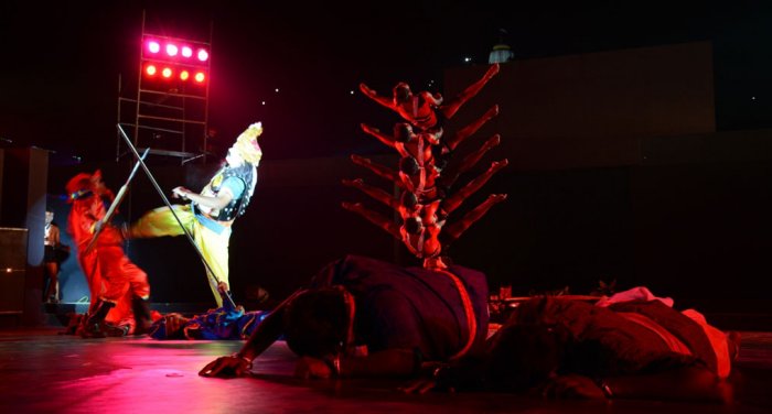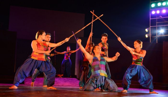 The dancer who very intelligently made use of the vast treasure of poetry in the Indian languages on the 'Nadi' and its many qualities was Leela Samson, whose group work Nadi - The River had a pan Indian perspective on the river, based on poetry in several languages of Tamil, Kannada, Hindi, Urdu, Sanskrit and Bengali. Starting with 'Adidano Ranga' to Rabindranath Tagore's 'Ogo Nadi' (rendered by the Bauls of Bengal), old Tamil poetry of Sangam literature (c 400 BCE to 300 CE) describing life on the Vaigai river, to Girish Karnad's 'Neerina mele' (one cannot write on the river which without memory lives in the eternal present), the Benares Thumri, 'Kinare Kinare' based on an old bandish by Ustad Taanras Khan's duaiyannazm on Hazrat Khisar in Islam, to Muthuswamy Dikshitar's Keertanam 'Gangai maam pahi', one was treated to how the greatest of minds, from time immemorial, in voices of love and longing have responded to the physically changing moods of the river, and of the deep philosophical insights into life the river provides - metaphorically and factually so intertwined with the warp and weft of man's life. Images like the tree growing and sprouting leaves, flowers, fruit, while anchored to its place, quizzically watching the restlessness of the ever flowing river; of the devotee in supplication addressing the river goddess, entreating help to anchor his boat; of the varying moods of the waters now carefree and rippling in joy, now tempestuously flowing and now narrowing like the slender-waisted woman (while flowing between Assi and Varuna) - all sensitively suggested in the group choreography where the group working with the same aim, does not imitate movements of one another. Each dancer stands out as an individual and yet part of the totality. With a composer like Rajkumar Bharati who retained some old tunes and added some of his own (the music presenting a host of styles - Carnatic, Hindustani, Tagore music, folk music and the Benares thumri style singing of a dadra) was rendered by melodious voices of Keertana Vaidyanathan, Srikanth and Sharmishta Chatterjee. Clarity of announcements in strong voices, added to the total impact and without a doubt, this production watched with keen interest, represented for the 2000 strong audience, the best of the festival. Martial arts have always been part of this festival. Pancha Bhuta (the five elements) in the Mayurbhanj Chhau style visualised by Ileana Citaristi with music composed by Shantanu Mohapatra and Niranjan Bhol and performed by a group led by Subhashree Mukherjee featured well trained male dancers with good group understanding - proof of the success of the project Chhauni in Baripada. Ranjan Mohanty's Mallakhamb Paik-Sahi Jatra in Puri is the only one of its kind in Odisha. Ma Buxi constituted a martial art display combining Mallakhamb with balancing tricks on the pole or khamb by sturdy men, along with Paika Akhada exercises. Trim bodied youngsters doing exercises came together to feature varying group pyramidal formations. The Paika tradition had its start in Jairaj guru, the minister handing himself to the enemy in order to save his King Mukund Dev, and being tortured to death by the enemy. Buxi vowing revenge years later is also incarcerated in jail from where he spreads the Paik message during confinement. The creation of the Paiks ultimately proved useful in fighting against the British. This festival provides a fruitful platform for these youngsters, trained in various methods to showcase their expertise.
