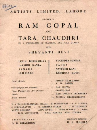 Tara Chaudhri - Pavlova of the Punjab! - Ashish Mohan Khokar Credit: Rare pics and document from The Mohan Khokar Dance Collection October 9, 2013 Kasuvandi, the detective of dance based films and cinema buff from somewhere in the outer space (blog writers sometimes don't want true identity be known, especially real name and provenance) first sent me info that Tara, the great, had passed away. That Tara Chaudhri, popularly dubbed the Pavlova of the Punjab, died on Sept 22, 2013, unsung in India, is not surprising. No obit, no news, no mention. So it is left to me, yours truly, to reconstruct her life and times. I'm additionally in a very privileged position because our families also knew each other personally. A direct source of that period is my mother, Bharatanatyam guru M.K. Saroja, who knew Tara personally, stayed with her in Lahore in undivided India and had common links due to Guru Muthukumaran Pillai, whom Ram took to Lahore to teach Bharatanatyam. Many moons later, Tara came home to us in Delhi in mid 70s when Ram was visiting us and even having left active dance for years, she looked like a royal star. Once a dancer, always a dancer.