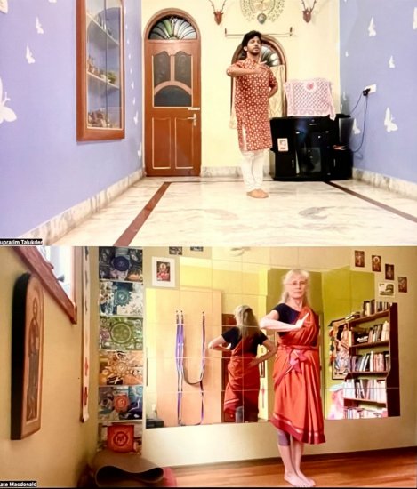A special Guru-Shishya Bharatanatyam connection - from Kolkata to Ottawa- Kate Macdonalde-mail: katetmacd@gmail.com July 9, 2025 आङ्गिकं भुवनं यस्य वाचिकं सर्ववाङ्मयम् । आहार्य चन्द्रतारादि तं नुम: सात्विकं शिवम् ।। How the sacred power of Bharatanatyam crossed the seas, pierced the isolation of the pandemic lockdowns, and continues to foster connection and growth... The Beginning: December 2020 The community center in Ottawa where I teach yoga in Canada's capital was locked down due to Covid. "Sheltering in place", I found myself scrolling through YouTube. I was interested in investigating what connections might exist between yogāsana and something I actually knew little about - Indian classical dance. I stumbled upon a video that gave me pause. In it, a young dancer from Kolkata - Supratim Talukder - interpreted a trending version of the Shiva Tandava Stotram. To me his embodiment of Lord Shiva was a window into the Divine: darshana. Supratim Talukder's YouTube channel transported me to the mystical groves of Vrindavan where Lord Krishna danced with peacocks, confronted me with the profound mystery of Ardhanarīshvara, and brought me to tears with the touching story of the low caste Nandanar whose steadfast faith was eventually rewarded with a miraculous vision of his Lord. I watched these videos again and again. Eventually, their creator reached out to me with a poster advertising his online teaching. This set my heart racing. Could I, at age 62, with no prior experience in the intricacies of Bharatanatyam, be initiated into the art...? With little to lose, and so much to gain - I reached out to Supratim-ji. We arranged our first online class! Fast forward to July 2025... It has now been 4 1/2 years since I started my journey into Bharatanatyam: 4 1/2 years of being inspired to practice (almost) every day! From my first awkward iteration of the Bhumi pranam, my young Guruji has guided me, over the years, through a repertoire of Adavus and Hasta Mudras, and introduced me to an Alarippu and a Jatisvaram. Most recently he has agreed to explore a Tillana with me. To be clear, at my age and stage, I have no aspirations of performing for a public audience: but my study of these choreographies has so many benefits! It definitely challenges my physical and cognitive abilities, and is, in fact, considered one of the best activities for healthy aging. When I attend a Bharatanatyam performance, I have a new appreciation for the demands of the form and the commitment that it requires. Supratim-ji's teaching has not been limited to a transmission of the traditional forms. He continually challenges me to explore these in novel ways. For example, when introducing an adavu, he will ask me to embody it using different emotional tones. This makes the outward form come alive in a special way. Observing that I am sometimes overwhelmed with the very precise work of recreating a new adavu step, he balances my practice of choreography with improvisational movement challenges. Interestingly, this periodic release of structure has very beneficial effects on my embodiment of the structured vocabulary of Bharatanatyam. His innate creativity keeps our online classes engaging - something I look forward to twice a week! The Guru/Shishya Paradigm ![]() A retired high school teacher, I have been privileged to discover that the transmission of Bharatanatyam is made possible through something both ancient and sacred: the Guru/Shishya relationship. In my own experience in the classroom, and in contemporary western culture in general, I think that this has, to a large extent, been lost. The traditional relationship that provided the foundation and support for an initiation into the arts has often been supplanted by a transactional paradigm. Supratim Talukder has given me so much more than a checklist of adavus and choreographies. In the spirit of the traditional Guru/Shishya relationship, he has shown a concern for my well-being on multiple levels, which I have been inspired to reciprocate. From this has developed a beautiful connection from my side of the world to his! Sādhana The ground of Bharatanatyam is truly holistic: those entrancing moments on stage grow out of the minutiae of life lived. Sacred dance is, after all, a great deal more than the correct execution of dance steps. By sharing with me his own experience of dance as a pathway to the Divine, my Guru has broadened my understanding of the art. As an example, Supratim-ji shared with me the intense and transformational process that he undertook to embody Vaibhav Arekar's choreography Ardhanarīshvara. Studying the elements of this choreography in Mumbai with its creator, Vaibhav Arekar, whom Supratim-ji honours as one of his Gurus, was just the beginning. Once back home in Kolkata, he dug in deep: how are the divine feminine and masculine energies embodied in the individual? How do these energies find expression in movement? And how can these energies find expression in this particular choreography? The process required a deeply focused and devotional approach and the results of this soul-searching can be witnessed in the power of his live performance of Ardhanarīshvara. On the auspicious occasion of Guru Purnimā 2025, I wish to express my heartfelt appreciation for all that my Guruji has given me over the last 4 1/2 years. Returning to my practice space with anticipation every evening, I perform the Bhumi pranam before my statue of Nataraja and thank Supratim Talukder for helping me discover the ecstatic path of embodying divinity through sacred dance. ![]() Kate Macdonald is a retired English teacher who discovered the joy of Bharatanatyam at age 62. Her Guru, Supratim Talukder of Kolkata, believes that learning can happen at any age. She loves to investigate and report on Indian classical dance in Ottawa, On
