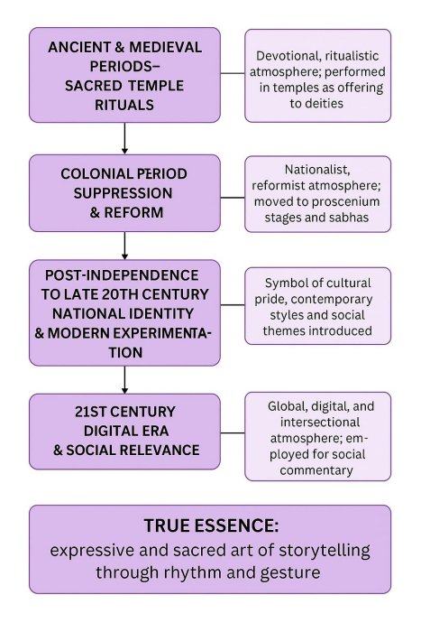 Cosmic cadence through proscenium time:Question and evolution of space across times in Bharatanatyam- Brinda Dhare-mail: brindadhar8@gmail.com July 13, 2025 ABSTRACT The term 'vivarta' refers to an illusory appearance of transfiguration. In a philosophical context, particularly within the Vedanta system, the doctrine of vivarta is utilized. The journey of space in Bharatanatyam, from temples to modern proscenium, incredibly moulds the spatial aspects through fusions, thus debunking the actuality of political Bharatanatyam, which has, however, remained constant for ages. Intersectional fusions then do more than blend contemporary politics with classical technique - they decolonize the very knowledge systems that uphold the dance's authority, thus furthermore challenging the idea that Bharatanatyam must remain frozen in a curated museum of authenticity. This, in turn, refuses the binaries of East-West or tradition-modernity, thus celebrating the dancers' repositioning as translocal, plural, and a political practice. It causes a change in the lens of observation - as refusal becomes a choreographic method - a powerful act of defiance against inherited norms. This refusal might take many forms: rejecting the use of overly casteist mythologies, refusing to perform in Brahmanical spaces, or declining sringara as a romantic language for male deities. The dancers' transformation from devadasi to symbol of nationalism, after the Western lenses' route to experience the dance form as 'exotic / vulgar,' highlights a larger cultural shift to a symbol of 'high art.' To conclude, as intersectional and political, Bharatanatyam is not a rupture from the past but instead a radical continuity - a remembering and reimagining. It's a practice of healing and resistance, of new reclamation and redefining the norms. As artistes continue to interrogate power through bodies, across space and time, Bharatanatyam becomes more than dance; it becomes a language entitled to liberation. VIVARTA AS PRAXIS In a philosophical context, particularly within the Vedanta system, the doctrine of Vivarta is utilized because it denies a sense of independence to pure chaitanya (consciousness). The initial stage of creation in this view is considered an abhasa, or mere appearance. The journey of space in Bharatanatyam, a classical Indian dance form, is a fascinating blend of tradition and cultural evolution and shifting performance settings. From its roots in temple rituals to modern proscenium stages, the special aspects of Bharatanatyam have constantly evolved, shaping and being shaped by the social and artistic landscapes of each period. FROM TEMPLE COSMOS TO VIRTUAL GRID: HISTORICAL ANCHORING In its earlier forms like Sadir, Bharatanatyam was deeply intertwined with religious and spiritual practices that primarily took place inside the temple grounds. These sorts of performances were often a vital and important part of everyday daily temple rituals carried out by devadasis (temple dancers) right in front of the deity inside the Garbagriha. The space was intimately crafted to foster a spiritual bond between the dancer, the deity, and a small select audience of patrons and devotees. However, with the rise of colonial morality and the anti-nautch campaigns of the late 19th and early 20th centuries, this vibrant ecosystem had to face a harsh dismantling. The colonial authority, backed by Indian social reformers, branded devadasi practices as immoral, obscene, and degenerate. As a result, the dance form was pushed to the fringes, and its proactiveness faced significant stigma. CHANGE IN LENS OF OBSERVATIONS The emergence of digital culture has also affected how Bharatanatyam is performed and presented, acting as a driving force in inventing its own social aspects and culturing its aesthetic. While mythological references remain, there is a seen evolution of the portraits that continuously mirror the changing cultural and social landscapes. The gender representation in the dance performances has become much more fluid; where women once depicted male deities like Lord Krishna or Lord Vishnu, today's male dancers are now taking on such roles as acid attack survivors and Goddess Kali. This cultural and phenomenal shift challenges the traditional and general rules and further questions the dynamic historical link between Bharatanatyam and the Devadasi system. Although the historical connection between Bharatanatyam and South Indian temple architecture has faded since the 18th century, the space for performers is an important, yet reimagined hub for symbolic reintegration and cultural expression. Although the refusal doesn't mean absence, it signifies a presence defined by different terms. It opens up room for new stories, diverse aesthetics, and varied bodies. It might mean interrupting the flow of a jatiswaram to insert spoken word protest or juxtaposing adavus with gestures of grief and rage. Thus, this is not just a breaking down of singular dance forms - they are the breakthroughs of meanings. This approach to refuse resonance is what scholar Saidiya Hartman refers to as "critical fabulation": a way of reimagining the histories that have been erased or overlooked through creative and speculative methods. In this context of Bharatanatyam, refusal might manifest as pushing back against the already existing patriarchal gaze, rejecting the underlying casteist narratives, and resistance in the expectation of spiritual transcendence. Such refusal is deeply generative in nature. It opens up new aesthetic terrains and political alliances. Then it shifts the question from "Is this still Bharatanatyam?" to "Who then gets to decide what Bharatanatyam is and what it becomes?" AESTHETICS OF CHANGE IN ATMOSPHERE Atmospheres that can be shared and collectively fabricated are conjured to specific feelings that help to connect bodies within each other to their already existing elemental circumstances. This is a capacity to generate a shared atmospher