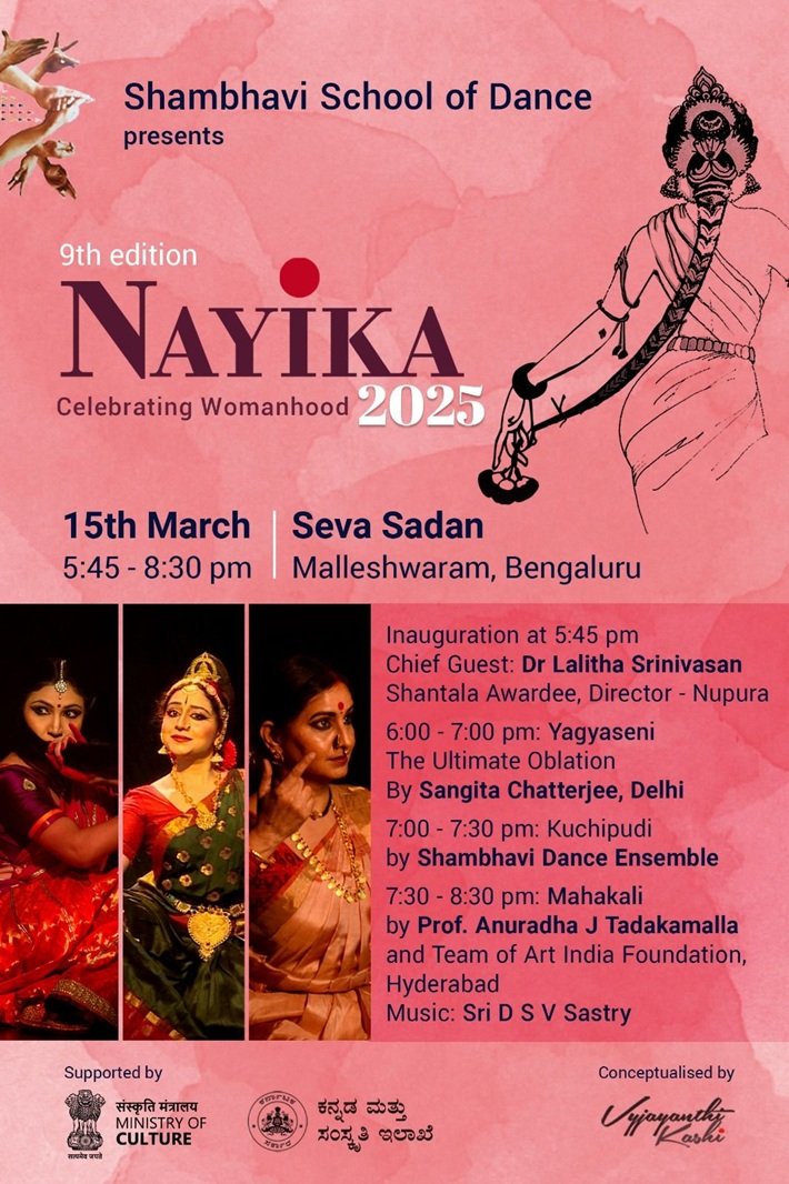 Shambhavi School of Dance presents Nayika Festival Seva Sadan, 5.45pm March 15, 2025 Bangalore March 10, 2025 ![]() Shambhavi School of Dance, Bangalore, headed by Kuchipudi exponent Vyjayanthi Kashi, is organizing NAYIKA, a one-day National Dance Festival on 15th March 2025 at Seva Sadan, Malleshwaram, Bangalore, from 5.45pm to 8.30pm. Nayika is a festival that reveres the spirit of the feminine divine, the dynamism of dance, power of storytelling, and the enduring beauty of our artistic heritage. As we step into the ninth edition of Nayika, we gather beneath a luminous canopy of tradition and creativity to celebrate the timeless contributions of women to the world of classical dance and the arts. This festival is not merely a performance - it is a tribute, a salutation to the women who have shaped, preserved, and elevated artistic expression across generations. As we embark on this journey through movement and melody, let us reflect on the unseen stories - of sacrifice, perseverance, and artistic brilliance - that have enriched our classical traditions. Each performance today stands as a testament to those who danced not just with their feet, but with their hearts and souls, leaving an indelible mark on the world stage. The Chief Guest is Dr.Lalitha Srinivasan, a Kendra Sangeeth Natak Academy awardee. PROGRAM 5.45pm - 6pm: Inauguration 6pm - 7pm: YAGYASENI by Sangita Chattejee, Kathak, New Delhi. 7pm - 7.30pm: Presentation by Shambhavi School of Dance, Kuchipudi, Bangalore. 7.30pm - 8.30pm: MAHAKALI by Prof.Anuradha J Tadakamalla and team of Art India Foundation, Kuchipudi, Hyderabad. Contact: danceindia@gmail.com |