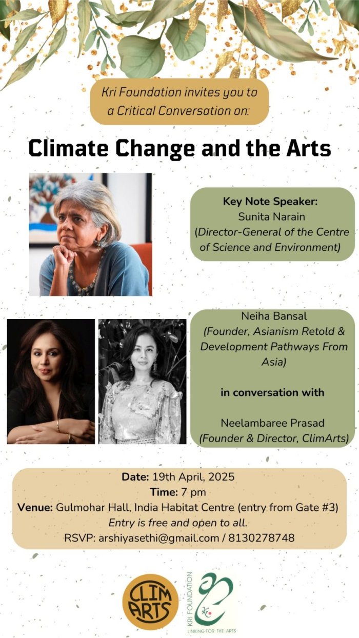 Kri Foundation presents Critical Conversation on Climate change and the Arts India Habitat Centre, 7pm April 19, 2025 New Delhi April 3, 2025 ![]() Creativity in climate conversations: the role of art in impacting action The world is in a climate crisis. We have the data, and the disasters around us to remind us of it every day. But between the information overload and calls to action falls the shadow. Why is it that deadlines are missed, solutions are fragmented and signals disconnected? How does one break the silos of science, policy, media and culture so that a multiplicity of voices can come together to effect change? Can artistic practices reshape narratives, create new paradigms of trust and inspire sustainable action? To explore these intersections, Kri Foundation and ClimArts present "Climate Change and the Arts: A Critical Conversation", an evening of discussion bringing together leading voices in environmental policy, sustainable development and the arts. Why critical? As Dr Arshiya Sethi of Kri Foundation, puts it, "There is no doubt that climate change is the most life-destroying problem before us today. It requires urgent action and here we have not even started the conversations with the gravitas needed. That is why I have called this conversation a critical conversation. We must have it. We do not have a choice anymore." The evening will open with a keynote address by Sunita Narain, Director-General of the Centre for Science and Environment, a leading figure in the field of sustainable development and environmental justice. This will be followed by a conversation between Neha Bansal, founder of Asianism Retold, an initiative on development pathways from the global South, and Neelambaree Prasad, founder and director of ClimArts, a platform dedicated to enabling climate action through storytelling. Explaining the significance of artists in climate conversations, Bansal said, "What does a paintbrush or a song say about our future? For one it reminds us, so powerfully, of the fundamental relationship between human beings and nature. A reminder that is essential to our work on climate action. It is therefore visionary for Kri Foundation to host this conversation understanding that while we already have in the room scientists, policymakers, businesspersons and students, we must have the artists..." Prasad, an Odissi dancer and strong advocate of the arts as a tool for science communication, said, "Art is not merely decorative for entertainment but a powerful cultural catalyst and a vital tool for communicating the story of our time - climate change." She added, "We see a lot of technical messaging which can be daunting and pushes the audience away. The doom and gloom in the news can generate paralysis and apocalyptic fatigue. What we need are stories of hope, potential, possibilities and such narratives woven with art, performance art can be very potent to nudge positive climate action." Dr Sethi, an arts professional and activist, added, "For long I believe that the arts have a persuasive power and constitute a power that few languages have. It's not for nothing that the polyphony of voices during the Bhakti movements used the arts as a tool for change. The arts impact sharply. The impact stays and the framework of the impact increases receptivity. Therefore, I feel that even today they are the best way to go for difficult and critical conversations." "Climate Change and the Arts: A Critical Conversation" will be held at India Habitat Centre, Delhi, at 7pm on April 19, 2025. |