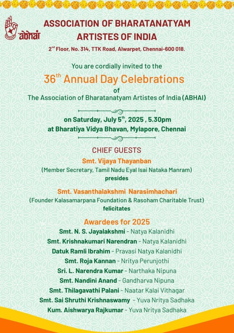 ABHAI presents 36th Annual Day celebrationsBharatiya Vidya Bhavan, 5.30pmJuly 5, 2025 Chennai June 21, 2025 ![]() ![]() The Association of Bharatanatyam Artists of India (ABHAI), a global community dedicated to the welfare and advancement of artists, announces its 36th Annual Day Celebration on Saturday, July 5, 2025, at 5:30pm at Bharatiya Vidya Bhavan, Mylapore, Chennai. ABHAI stands as a vital support system for artists worldwide, with Shaakas across India and the USA. Primarily a welfare institution, ABHAI provides crucial assistance to artists in need through its monthly pension scheme. Beyond direct support, ABHAI is deeply committed to nurturing the future of Bharatanatyam and the arts: