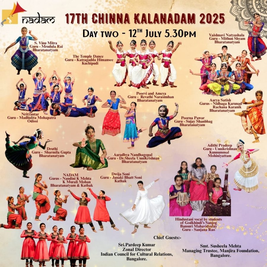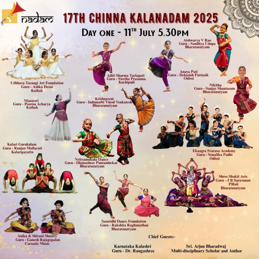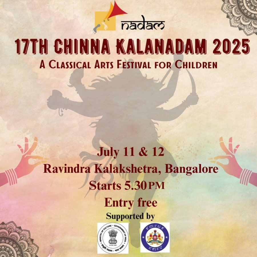 Nadam presents 17th Chinna Kalanadam Festival Ravindra Kalakshetra July 11 & 12, 2025 Bangalore July 4, 2025 ![]() Nadam presents its 17th edition of Chinna Kalanadam Festival for budding talents. Festival: Chinna Kalanadam Dates: 11th & 12th July 2025 Venue: Ravindra Kalakshetra, JC Road, Bengaluru Time: 5:30pm to 8:30pm Ph: +91 98802 01608 / +91 98458 08152 E-mail: nadamdance@gmail.com Website: nadam.in ![]() ![]() |