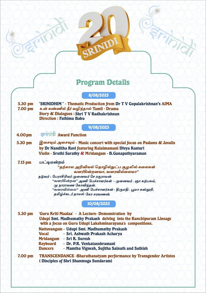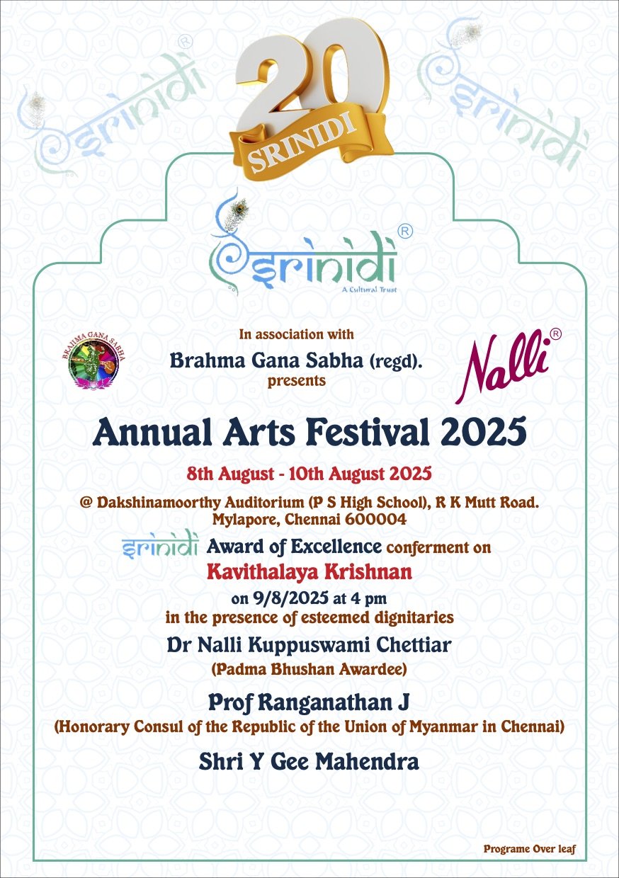 Srinidi presents Annual Arts Festival Dakshinamoorthy auditorium August 8 - 10, 2025 Chennai August 3, 2025 SRINIDI, a registered cultural trust formed in Chennai in the year 2005 with the sole aim of providing a platform for deserving artists to showcase their talents. The founder-trustee of SRINIDI, Divya Kasturi, academically an Electronics Engineer with a Master’s in South Asian Dance Studies, London, is a professional South Asian Dance practitioner operating in the sectors of Performance Choreography, Teaching, Outreach and Interdisciplinary practices. Her past acumen of being a Television personality (SUN TV, K TV, SUNNEWS, Raj TV, Jaya TV and Doordarshan) enabled a visibility for developing her dance skills and her career has shaped in and through the Chennai Arts festivals (Margazhi Season and others). She currently manages an artistic career between Chennai and London (divyakasturi.com). SRINIDI Trust - an Artist-led initiative is now in its 20th Year! With a small team of like-minded professionals, SRINIDI has reached this landmark year of operation. Navigating its development envisages establishing an unbiassed arts institution embracing different kind of arts through collaborative efforts. For info: (044) - 24897584 / +91 9841002037 e-mail: divyakasturicompany@gmail.com ![]() ![]() |