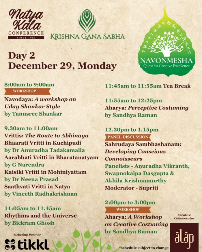 Krishna Gana Sabha presents 43rd Natya Kala Conference Dec 28 - 30, 2025 Chennai Convenors: Nirupama & TD Rajendra August 7, 2025 The 43rd Natya Kala Conference by Krishna Gana Sabha, is conceived and curated by Bharatanrityam and Kathak exponents, Nirupama & Rajendra. This year, under the theme NAVONMESHA: QUEST FOR CREATIVE EXCELLENCE - the ever-fresh blossoming of creativity - you are invited to witness Pratibhaa in all its forms. In this edition, you have the possibility to explore a rich tapestry of performances, panels, and workshops that celebrate the dance between tradition and innovation. From iconic legends to young trailblazers, each moment is crafted to ignite thought and inspire action. The NKC Season Pass with perks aplenty is available for purchase until September 5, 2025. Tickets ![]() ![]() ![]() |
