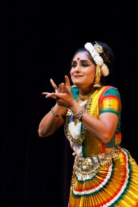 evening would be extraordinary. When the music begins and Sunanda glides onto the stage, her appearance takes my breath away. She emulates the fiery splendor of India’s culture, and the unparalleled graceful expression of devotion to God through the arts. If you take her costume on its own – with all its gold, silk and gemstone – it might seem ostentatious on a mere mortal. The magic begins when Sunanda invokes Lord Ganesha, remover of all obstacles, in the dance entitled Ananda Ganapathi. In this dance, she humbly asks for the Lord’s blessing for the success of this performance. The blessing sought is not only for herself but for her audience to feel exhilarated. The charm of her subtle eyebrow movements, the hallmark head wobble, her intricate hastas and graceful swaying of her body emulate the lasya of Ganesha’s mother Parvathi. Sunanda’s subtle eye movements turn to a fierce gaze as she moves to tie a tiger skin around her waist and take a majestic pose, and we recognize Shiva, Ganesha’s father. She then displays the wonder of a devotee witnessing the jubilant dance of Ganesha, and the spell has been cast. The audience has become the devotee, blessed by dance and music. The next item Sunanda presented was a composition of the Maharaja of Travancore, Swathi Tirunal’s “Chaliye Kunjan Mo.” Here, as the heroine inviting Lord Krishna to an arbor on the banks of the river Yamuna, Sunanda takes our hand and gently invites us to a world of lush and lyrical beauty. In her dance, she embodies the resplendent landscape of Kerala, the birthplace of Mohiniattam. With delicate and elongated red-tipped fingers, she gently reaches for Krishna’s irresistible yet elusive hand. If her gentle grasp could not persuade him, surely her magnetic gaze could. She shyly glances from her beloved to the arbor – “see how lovely it is there, come with me.” How can he resist such charm? If that is not enough to entice him, she then describes the allure of the river bank, the call of the cuckoo, and the scent of flowers in the cool breeze (which the bees cannot resist, so why should he?). She glides and dips across the stage, illustrating the boundless flow of devotion, as deep and powerful as Yamuna itself. The subtle abhinaya and the intricate nuances she brought out was a delight to watch. In “Oru Magal,” an