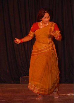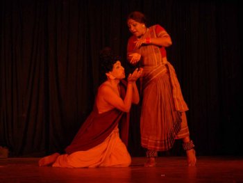 years enthralled the audience. Dance dramas with social messages are not easy to produce, more so as the message passed on relates to a different time. Invocation by Balakka, as Bala Kondala Rao is affectionately called by students, was a dance invocation with presence of Gurudev. Good thinking. The drama unfolded with Chandalika, an innocent girl unaware of her social status (of her times), seeking to offer prayers, wanting to buy items to be offered to God. She faces the cruel reality soon after. The scenes of Chandalika getting rejected by flower vendors, by milkmaids, and finally by the bangle sellers effectively convey harsh reality of rejection to her. Rejection proves to be bitter and the sadness arising out of it was portrayed by engrossing abhinaya of Balakka. As she wipes the curd and milk spilt on her by the vendors, the extent of dejection sinks in, and giving way to anger, Chandalika almost explodes. The array of expressions brought about in the transformation from an innocent girl to that of a rejected fiery woman, are worth mentioning. There appears a thirsty monk (played by Tatarao) in front of her as if by divine intervention. His soothing presence and his plea to Chandalika for water act as acceptance. She forgets her earlier feeling of pain of rejection and turns blissful, joyous, regaining her feeling of self-worth and all this in disbelief. How wonderful was the enactment of Balakka to the contrasting emotions! The lifting of disappointment and the ecstasy were very well portrayed. Only an experienced and an expert can fathom and depict a view into complex human nature. Chandalika, being sensitive and innocent in nature, now desires the monk who by his simple act of acceptance of water offered to him endears himself to her. She takes the help of her mother Maya, whose magical powers and witchcraft unleash evil forces and draw the monk to Chandalika. Maalyada Anand played the role of Maya with intense bhibhatsa - as she concentrates all her skill in bringing the evil forces to act. There were some rigorous jathis and astonishing expressions befitting the skills of Maya in witchcraft. With the tortured monk in front, Chandalika regrets. Seeing the pain she caused the monk, Chandalika feels guilty of sin. She repents for her mistake and now feels rejection, her own rejection of self. What a turn of events! The monk however pacifies her and as a mark of acceptance, once again asks her to fetch some water to satisfy his thirst. He then accepts her as his disciple and she follows him.