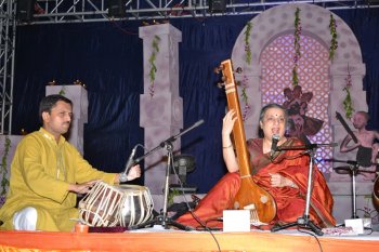 Surabhi Tandon of the Lucknow Gharana of Kathak is a young and upcoming artiste who has become known in the past few years because of the experiments she has been doing in Kathak. Most noticeable experiment was the costume designing and recreation of the traditional ‘bhavas.’ Renowned vocalist Ashwini Bhide Deshpande’s flawless rendition of Khayals in raag Kedar and Sohani were very appreciated. Ashwini’s range of voice has that aesthetic quality that is unique to Jaipur Atrauli Gharana. Her “Shyam jhoole hindol kunjan ban mein” and Radha Hindol were specially created for the occasion of Radha Ashtami. She finished her performance with “Mharo pranam banke bihari ji” traditionally sung in the Haridas Festival by several artists like Kishori Amonkar, Shobha gurtu and Arti Anklekar.