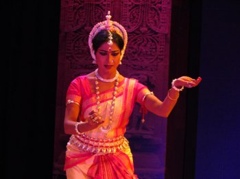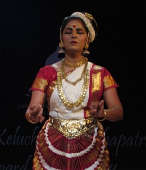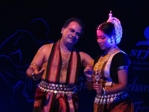 Ratnagiri is just 5km away and one has to climb up a few steps first. The magnificent ruins comprise 2 quadrangle monasteries, a single winged large brick monastery with a beautiful doorway, a sanctum with a colossal Buddha, an enormous head of Buddha, and many Buddhist sculptures. There are brick shrines, a large stupa with numerous smaller stupas around it, and a tall Buddha sculpture placed dramatically in front of a banyan tree. Ratnagiri was a great Tantric centre of Buddhism. Both these places are beautiful, now in ruins amidst lush greenery but the view now from the hills showed a landscape inundated with floods - water as far as the eye could see. The visit to the Ratnagiri museum and to Lalitagiri is for the next visit to Bhubaneswar! The Jajpur village people staged a dharna in the middle of the road protesting against govt inaction while people were starving due to the floods, and it was after 90 minutes that they allowed our cab to move (as a special concession), resulting in our missing a part of the first performance of the evening, Mohiniattam by Sunanda Nair from Texas. Clad in a beautiful white costume with maroon border, she presented one full length item “Bhavayami Raghuramam” depicting the story of Ramayana. The sethu bandana scene had Sunanda heaving and throwing rocks so realistically, we could almost envision the bridge shaping up. One could see touches of her Kathakali training now and then. The item ended on decorations being made for pattabhishekam and welcoming the royal couple with music and fanfare. Sunanda was all praise for the appreciative audience and hailed the GKMA Festival as one of the important dance festivals of India.