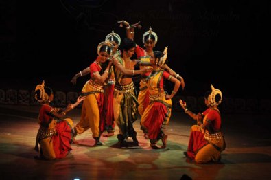 The first performance of the evening was ‘Swagatham Krishna’ by the young artistes of Srjan. Arpita Swain, Preetisha Mohapatra, Pooja Bhattacharya, Sipra Swain, Riyanka Chakraborty, Aparimita Jena and Rinku Sahu presented a well choreographed and coordinated recital on the handsome god of Mathura, the prince of romance, who has conquered Mastikasura and Chanura, overpowered the dreaded serpent Kaliya and provided protection to Gokula. “We sing with you, we sing for you, we dance with you, we dance for you. Your body carries the fragrance of divine flowers. We find you irresistible.” Choreography and mardala accompaniment is by Ratikant Mohapatra, vocal by Satyabrata Katha, sitar by Rabi Shankar Pradhan, sarod by Sunando Mukherjee, violin by Surmani Ramesh Chandra Das and Agnimitra Behera, flute by Srinibas Satapathy, bass guitar by Bhabotosh Mohanty and synthesizer by Subrata Routray and Iraj Kumar Rath. Every year, Srjan presents a new production for the festival. Ravana is a central character in Ramayana and this year, Srjan’s production ‘Ravana’ projected him as the hero who chose death in order to attain moksha. The sutradhar group wove the twists and turns in the story while Ratikant Mohapatra, clad in a black costume with maroon border, essayed the title role of Ravana. A serene Ravana conducts the mahayagna to get a glimpse of his destiny, then cuts off one of his heads and throws it into the flame as an offering. He strings a few blood vessels, fashions a veena and plays celestial music on it. Lord Brahma appears and says Ravana is destined to live forever and can attain death and salvation only if he abducts the pious Sita. Ratibabu scored with appropriate abhinaya, looking crafty as Ravana donning the orange robe of a sadhu to lure Sita to step out of the protective line in front of her house. The abduction of Sita (Sujata Mohapatra) was beautifully choreographed. When his wife Mandodari (Bijayalaxmi Satapathy) pleads with him to let Sita go, Ravana says he is prepared to die at the hands of Rama, the incarnation of Vishnu, to attain his moksha. The battle scene was portrayed suggestively with restraint and eventually the fearless Ravana falls dead. Ratikant Mohapatra impressed as he just collapsed on his back! The sutradhars appear for a final scene extolling the majesty of Ravana, who even in death, emerges as a devoted and valiant king who displayed rare courage, integrity and perseverance. Concept and choreography was by Ratikant Mohapatra, music by Debasis Sarkar, script and Sanskrit rendering by Manmohan Acharya, English narration by Aditya Mahapatra. It was a brief role but Sujata’s expressive face reflected beautifully the yearning to have the golden deer, the terror at being abducted and entreating Ravana to free her. In fact, the minute Sujata entered the stage as the beautiful Sita, there was thunderous applause! Rajib Bhattacharya played the roles of Brahma and Rama changing his body language accordingly, Subikash Mukerjee was Lakshmana. The sutradhars were Rajashri Praharaj, Bijayalaxmi Satapathy, Geetanjali Acharya, Kaustavi Sarkar, Manosmita Panda, Swagatika Sahani, Rajneeta Banerjee and Aishwarya Singhdev. The group sequences were well choreographed and coordinated and the costumes aesthetic. The presentation was wonderfully edited to a compact 45 minutes with clear focus on Ravana and suggestion of other connected episodes of the Ramayana through the sutradhars, but one felt something more was needed to bring out the intensity of Ravana’s heroism. The ever changing bright lights from red to blue to green to yellow was distracting, especially when powerful scenes were being portrayed.