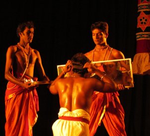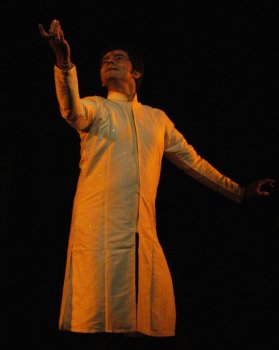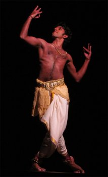 Day two took off with a group presentation by L Narendra Kumar and his Anusham ensemble, who were called in 12 days before the fest since the artiste signed on for this slot could not make it. He chose to depict different types of abhinaya. The percussionist was seated on one side of the stage, the flautist and vocalist on the other side. Starting with the melodious strains on the flute by Devarajan, angika abhinaya was portrayed through the Panchatantra story of the lion and rabbit, with Narendra having his face swathed in a bandage so as not to automatically emote with his face! Hasta abhinaya saw the dancer seated behind a screen held by 2 dancers and depicting the story only through his hand movements. The story of Vali and Sugriva was chosen for vachika abhinaya. Narendra was quite convincing as Vali and the fight sequence with Sugriva brought a flash of interest into the item. When in the throes of death after the arrow from Rama pierces him, Vali says, “You did not kill me, you killed dharma…” The lower tones of the spoken dialogues in Tamil (written by Prof. Raghuraman) were audible only to the first few rows since he did not have a body mike. The dressing up started behind a tirashila to portray aharya abhinaya. Narendra emerged from behind the screen in his dhoti costume and continued to make up his face looking into a rectangular mirror held by a dancer. Wearing the horns on his head, he then danced the Nandi chollu (words by Lalitha and Srinivasan, students of Ranganayaki Jayaraman and Suryanarayanamurthy), aided with brilliant percussion by NK Kesavan. The finale saw the satvika abhinaya rendered as a solo by Narendra to an annamacharya kriti “naanaati bratuku” sung soulfully by vocalist Srikanth. It is an interesting concept, but except for the last item, the presentation was more suited to a lec-dem and not for a full length performance. Labeled as a work in progress, the program held the audience interest only in parts and the main dancer totally overshadowed the rest of the ensemble. According to long time dance observer Ashish Khokar, “Classical dance is the art of suggestivity. Somewhere in Narendra's depiction the lokadharmi aspect took over natyadharmi. While his thinking and concept were original and refreshing, its execution by his group was lacklustre with Narendra undertaking nearly all stellar roles.” Those expecting the usual lively choreography by Narendra and his energetic young group of dancers, were rather disappointed and disjointed announcements by the compere were more a hindrance than help. Says Narendra, “People expect only fast paced items from us, so I wanted to show that I am a thinking dancer too. I love animals and always watch channels like Discovery and Animal Planet. For hasta abhinaya item, I made up my own story of a happy pair of deer in a forest. The male goes in search of food. When a lion appears on the scene, the pregnant deer hides behind a tree. When the male deer returns and sees the lion, it fears for the life of its mate and chases the lion, eventually wounding it with its fearsome horns. I saw one such incident on TV. Even in the last item, I have given a contemporary interpretation to the lyrics to convey the message of doing no harm to man or beast, not to disturb animals and to protect our forests.”