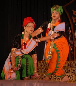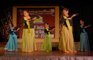 From Bangalore, Murali Mohan Kalva and Nandini Mehta’s troupe presented Kathak. I had an occasion to se a CD of their choreographic work in Kathak based on Purandara Dasa’s immortal lyrics “Krishna nee begane baro,” of mother Yashoda cajoling baby Krishna. Murali Mohan and Nandini have imaginatively treated the lyric from the viewpoint of the parents Nandrai and Yashoda, in different situations evoking vatsalya bhava. They fit into the roles and give another dimension to the lyric for interpretation and exposition. Highly enjoyable. Their group of Kathak dancers displayed good training. Their presentation had polish and command over tala and padhant, recitation of mnemonic syllables et al were well received, showcasing the salient features of Kathak. The nritta numbers were enjoyable. Murali Mohan and Nandini Mehta have been doing excellent work in Kathak in Bangalore and have been performing in major national festivals. Therefore scheduling their work in this festival was a welcome attempt to bring to the notice of local audiences, dancers from other states. Manipuri by Poushali Chatterjee from Kolkata had the colour and eye catching aharya with a polished repertoire of late Guru Bipin Singh. I was very closely associated with Guru Bipin Singh and have seen Poushali studying under him from a very young age. Therefore, it was like a trip down memory lane since I had the good fortune to witness a number of choreographic works Guruji created for the Jhaveri Sisters and is being performed by his large number of students. Basant Raas with gorgeous Manipuri mirrored skirts and gossamer veils, typical peacock feather crown for Krishna and dazzling ornaments invariably cast a spell on audience wherever it is performed. Debanjali Biswas as Krishna and Poushali as Radha, with other dancers as gopis evoked the beauty of Basant Raas, and festive mood. Vidyapati’s “kahe madana dahat tanu hamar” – “Why do you burn my body, O Kamadev?” says Radha in a beautiful song to Kamadeva who mistakes her for Lord Shiva, as she adorns herself with a tilak which is mistaken as a third eye, an ornament for hairdo which is mistaken for Ganga, and so on. Performed by Poushali with consummate artistry, it had all the beauty and charm of delicate Manipuri movements and lyricism. Guru Bipin Singh had trained female dancers to learn pung playing. The item known as mridanga vadan by two female dancers seated on the floor creating intricate talas playing upon the drums invariably brings down the house. Debanjali and Poushali won rounds of applause for their expertise. As is known, Guru Bipin Singh and the Jhaveri Sisters have a sizeable body of repertoire where quick changes of costumes and a variety of solos, duets and group numbers are presented with finesse and elegance. If I sound partial in my appreciation, I think I have terms of reference and when I see the next generation carrying on the tradition so competently, I feel reassured of our great art.