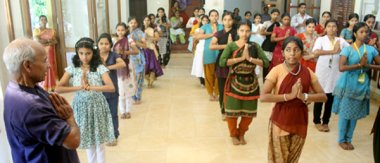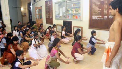 Guru Naripetta Narayanan Namboodiri is a renowned performer of Kathakali. The highlight of his introduction to Kathakali was his power point presentation. A vocal presentation came alive in visual format. He began by paying homage to his gurus, Kumaran asan who donned pacha vesham as a Kathakali performer and Vasudevan asan whose minuku was famous, thereby suggesting that the learning of Kathakali as a performing art is rooted in gurukula tradition. A student starts at an age from 10 to 15 and the learning process goes on for a minimum of 12 years to mould a professional artiste. The presentation showed how concentration is crucial to the challenge of learning. Real growth of an artiste takes place over the years as the aspirant becomes aware of his physical and mental potential for performing roles that suit him. And the artiste should aim at a feeling of fulfillment. Kathakali is just 500 years old. Its roots lie deep in the many performing folk arts of Kerala like Theyyam, Padayani and Ottamthullal, the martial art like Kalaripayattu and dance dramas like Koodiyattam, Krishnattam, Ramanattam etc. Patronized by chieftains and kings, Kathakali traversed the length and breadth of Kerala, slowly acquired classical proportions, attained an iconic status and international fame with the efforts of Kalamandalam, the premier institute of Kerala. The very name of the art form defines Kathakali: the dramatization of a story. According to the master, the building blocks of the architectonics of Kathakali are body posture, abhinaya and mudras within the parameters of natyadharmi. The stories are already known as they come from mythologies. And theme gives prominence to one rasa and one vesham or form. For example, Raudhra Bheema is such a character that arises from a particular context in a special costume which showcases anger as the dominating rasa with appropriate bhavas in varying tempo. More than the story line, Kathakali is concerned with the elaborate presentation verging on exaggeration. Staging the theme with nuances of a bhava leads to rasanubhava. Just the namaskaram to the panchabhootas illustrates its signature style with all its subtleties. Its body language is rooted in Kalaripayattu. Stylized hand gestures that escort exaggerated facial expressions highlight an emotion. Use of eyebrows, eyes, cheeks, lips, and neck are pivotal to create the mukhabhinaya. And of course Kathakali makes use of Shudha nritta for appreciation and enjoyment. Narayanan Namboodiri explained the terminology and different segments of a performance. Purappad introduces the character with kalasams. Here, body language becomes prominent in both quick and slow tempo. Kalasams is rasabhinayam with stylized gestures ranging from thandava to lasya nritta. The lasya nrittam is comparable to Mohiniattam style which speaks of a symbiotic relationship of male oriented and female oriented dance forms that grew in the same geographical region. The hand gestures used in Kerala art forms is based on “Hasthalakshana Deepika” for its grammar and vocabulary. A Padam consists of translating a verse into visual form to the accompaniment of rhythmic beats in slow, medium and quick tempo. As Kathakali traversed decades, experiments were made. Maddalam and chenda for percussion and edakka for female characters came to be the accepted norm now. Chenda and edakka are unique to Kerala, and Kathakali has become musical now. Costume is integral to Kathakali demanding natya dharmi. Pacha vesham depicts heroic dimensions; Kathi portrays anti-hero; minuku women and sages; kari, the evil. Individuality is established by abhinaya from the generalized costume. The second half of the program showcased a parading of navarasas and live presentation of body movements and mudras, the students getting a sample by participating with the master. Mostly female dancers, they stood the harsh litmus test of a masculine dance drama.