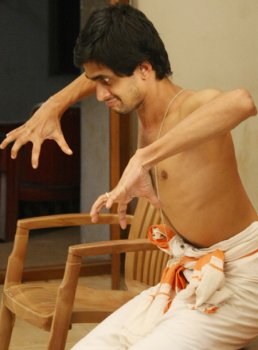 Sooraj Nambiar initiated into Koodiyattam by none other than the legendary Guru Ammannur Madhava Chakyar is a promising artiste whose devotion to the oldest dance drama of India is non parallel. He addressed the uninitiated and went to the elementary aspects to open a gateway to an ancient performing art form. There was a time when Sanskrit drama prevailed throughout the subcontinent. While enacting the classical texts, dramaturgy was shaped and molded by local traditions and influences. In those days, Koodiyattam originated in Kerala, with its own unique features. As contexts for enacting come from well known mythologies, the performance concentrates on abhinaya. The performer celebrates his imagination in presenting a character. Basically, in Koodiyattam, the body posture of the performer determines the dimensions of a character. A posture close to aramandalam with feet apart in specific measure is the first of its alphabets. The eye is exploited by a performer to give heroic, larger than life aspects of a personality. The student learns 10 types of exercises for the eye alone. The inner vision concentrates on the unseen objet. For a distant object, the eye travels to the unseen distant horizon; to look up, the sky is the limit; to look down, the eye reaches the depth of a well. Facial expression is an important aspect for training. Movements of eyebrows, projecting the eye, holding lips and cheeks and moving them in a trained manner, expanding or contracting the face to highlight a rasa or bhava are crucial in Koodiyattam. Sooraj Nambiar demonstrated a celebrated piece in Koodiyattam. The context is Bheema going in search of the enchanting flower, Kalyanasougandhikam. On his way, he is struck by the majesty of an elephant in the deep forest. Gigantic in proportion, its profile is perfect: magnificent head, great tusks, large ears, superlative trunk… Bheema enjoys the glory of a wild creature as much as the elephant enjoys its food, the luxuriant palmyra leaves. The performer continues with the description of how the perfect elephant enjoys water. And then as the elephant slumbers, a python attacks, trying to swallow its hind leg. Emotions range from doubt to fear; the drama of struggle caught in the jaws of death echoes in the valley. Worse comes to worst as a lion spies the scene from the top of the hill and attacks the kingly beast by clawing at its superb head. Caught between two powers, the drama in the jungle is a tragedy foretold. Unable to stand and see the sight, Bheema leaves the place. Without costume, without make up, the demo was simply fabulous for the inexperienced aspirants. The workshop was a revelation of the treasure this ancient civilization has bequeathed to performing arts. What marvels we have in our inheritance, ancient in origin, classical in dimension, inspirational to artists all over the world! Padma Jayaraj is a freelance writer and a regular contributor to www.narthaki.com | |||||||||||||||||||||||||