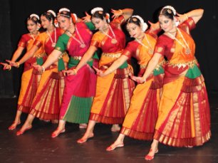 Samskriti Foundation's joyful program ‘Ananda’ - Anu Samrat e-mail: anu.samrat@gmail.com December 21, 2011 How does Yanni's music feature in an Indian classical dance program, I wondered, when I read the program brochure on a cold November evening in Chicago. I was at the Centerstage auditorium to attend Samskriti Foundation's recital titled ‘Ananda – new and vintage choreography in Bharatanatyam and Kuchipudi.’ I'll admit that I have not heard much of Yanni's music and all I knew was that it was totally not the type of music traditionally used for either dance form. My interest was definitely piqued but this was going to be the last item of the show, so I had to wait. The Samskriti Ensemble, lead by dancer Shoba Natarajan, consisted of Jalaja Hemanth, Janaki Nair, Anjali Nandan, Sailaja Kambhammettu, Vinod Menon, Srilekha Sama, Lakshmi Thirumani and Swetha Vijayaraghavan. The evening began with a beautiful mallari, which was followed by an alarippu. A mallari is the song which is played (usually on the nadaswaram) when the utsava murti of a temple is taken out in procession, so the music is grand as it has to grab everyone's attention. This mallari was choreographed to match the music and was riveting. Such an oft-repeated item like an alarippu was given a fresh look with imaginative choreography. It was split into three sections of tishram, khandam and mishram, with 3 dancers for the first section and 5 for the second. Logically there must have been 7 for the third section, then or at least that must have been the plan, but things don't always go according to plan, so there were a total of 5. What made the alarippu look different was that none of the dancers were facing the audience all the time (which, I realized after watching this one, usually makes it appear like a class room session). The second item was "Gayiye Ganapati" in Kuchipudi style. Here the four Kuchipudi dancers did a fine job with typical Kuchipudi adavus and movement and the program got off to a great start, with these two items in the two different styles. The third piece was a varnam “Swami nan undan adimai” in raga Natakurinji, adi talam, a composition of Papanasam Sivan. Shoba Natarajan and Vinod Menon presented this and they decided to interpret the lines in two different ways, covering both the anthar bhakti (inner devotion) and bahir shringaram (outer love). The idea to portray it this way - in parallel, was different and interesting. From the notes I took down when this item was announced, some of the lines depicted were: “The world knows I am yours” begins the lyric. It is interpreted as: “The world knows I have always been in love with you” and also interpreted as “The world knows I have always worshipped you.” “Do not delay, come to me right away” – says the lover. “By singing your name, I cross the ocean of worldly life”– says the devotee. “When will I see your dancing feet in Chidambaram?” – questions the devotee. “When will those dancing feet of yours ever find me?” – wonders the lover. The jathis for the varnam were limited, were not long and were not designed only to display their nritta skills and that was good, because the bhava of the varnam was not lost throughout.