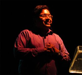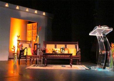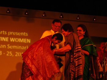 MAD and DIVINE women - Mystic saint poets of India and beyond Natya Darshan Seminar - Morning Conferences Day 1: Striking aesthetics and seamless execution - Kiran Rajagopalan e-mail: kiran.rajagopalan@gmail.com Photos: Lalitha Venkat December 23, 2011 Bharatiya Vidya Bhavan’s main auditorium stage was aesthetically transformed for the inaugural day of ‘Mad and Divine Women.’ Conference attendees were greeted to a spectacular vision of a white temple façade lit with lamps, ingeniously designed by Rex and Victor Paulraj to serve as a beautiful backdrop and a projection screen. In addition, a stately wooden sofa and chair were placed on stage for the delegates to sit on during the proceedings.