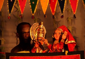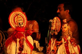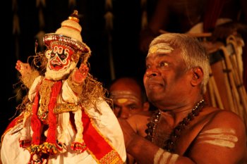Opening with the ritual pooja or worship of the puppets at the residence of Chamu Pandaram with the auspicious sound of conch, chengila, edakka, elathalam et al at the Mariyamma Kshetram of Paruthippulli village, the festival was formally inaugurated by the senior most puppeteer of this traditional family, the 86 year old Karuppan Pandaram. There was also a workshop where Gurus like Ravi Gopalan Nair and K Sreenivasan trained the young talents prior to the evening performances of Kalyana Saugandhikam and Dakshayagam. The villagers dressed in their colourful garments poured in large numbers as if it were a festival of the sort. The same excitement continued throughout the weeklong festival at other venues comprising Kodumbu Gramam, Poomullimana, Kothara, Kullukkalloor, Kottakkal, Azhvancherimana, Tavanur and Irinjalakuda where it concluded at Natana Kairali. The Pavakathakali performances of Kalyana Saugandhikam, Dakshayagam and Duryodhanavadham during the festival were written and directed by G Venu and performed by puppeteers KV Ramakrishnan, KC Ramakrishnan, Ravi Gopalan Nair, K Srinivasan and Kalanilayam Haridas. Accompanying musicians were V Thankappan on chenda, Kalanilayam Unnikrishnan on edakka and Kalanilayam Ramakrishnan as the vocalist who enhanced the rasa-bhava of each and every dialogue with his melodious singing. Narayanakutti was the stage decorator who used the palm leaves to create wonderful flowers, intricate lattice patterns and the Torana- Bandhanwaars with his imaginative creativity.