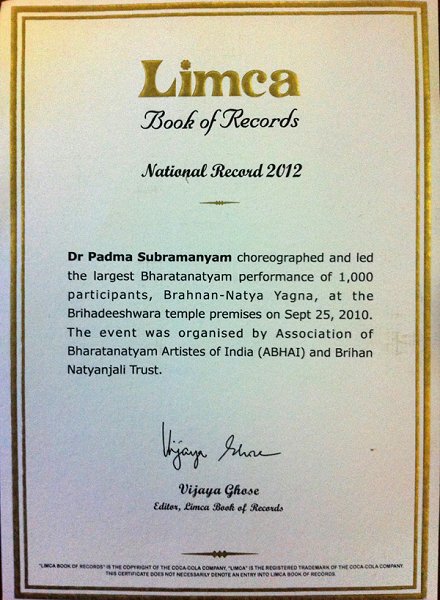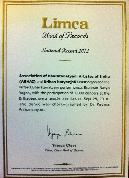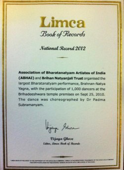 Rajarajeswaram 1000 enters Limca Book of Records February 27, 2012 On September 25, 2010, 1000 dancers performed Bharatanatyam at the Brihadeeswara Temple in Thanjavur as an offering on the occasion of the 1000th Anniversary of the temple’s consecration. Dr. Padma Subrahmanyam (President, ABHAI) choreographed three items and led from the front. The event was organized by the Association of Bharatanatyam Artistes of India (ABHAI), Chennai and Brihan Natyanjali Foundation, Thanjavur. Through the efforts initiated by KS Sudhakar of Swathi Soft Solutions, who documented and helped web stream the event live, the unique Brihan Natya Yagna called Rajarajeswaram 1000 has entered the Limca Book of Records as “National Record 2012.” ABHAI and Dr. Padma Subrahmanyam have received citations. |