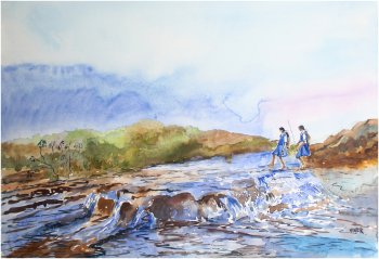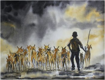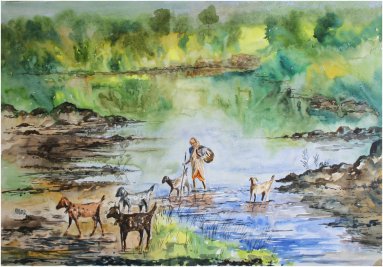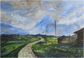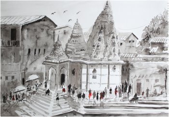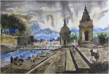 The water colour paintings in pastel shades are the charming village scenes, agrarian in ethos, with panoramic views of fields and rivers that mirror the skyscape and the landscape. They look like cinematic shots aesthetically fulfilling, amazingly natural, yet artistically wrought. The soul and spirit of India lives here in her villages, where bullock carts are yet part of life, where men and women live among animals and birds in the lap of nature. Village settlements are dominated by huts like an island in the middle of expansive plains. When the age old rhythm of an agrarian community is the unheard melody that emanates from these paintings, realistic sketches of everyday life in towns and cities are depicted in somber colours, which is another face of India. Humble people toiling among cars and bicycles in towns, tall buildings that tower over cityscapes seem joyless in dark hues. The pastoral scenes are juxtaposed to narrow lanes amidst skyscrapers choked with motor vehicles. Well dressed city people stand apart from the rural folk who live among domesticated animals. Temples on the river bank are another series. How can India be complete without her religious beat! Spirituality has brought waters to the plains of India in its mythical times. Ever since, the Ganga has filled each water body of the subcontinent in its racial memory. Here, the temple bells have resonated the chanting of the Ganga where rituals are a mode of worship, a way of life. Even when the paintings seem to be a real representation of the natural, the alchemy of the artist transmutes them to art. The dark rain clouds over the golden field, ripe with Midas touch is a beautiful painting in contrasting colours, yet it sends a gloomy message: of our troubled times of erratic rains, the havoc created by untimely flood, the ominous climate change. Roads and electric wires span the miles bypassing development for the poor villagers.