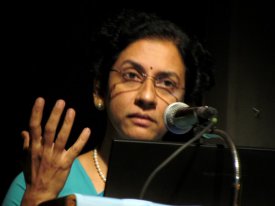 It was an interesting mix of lecture and slide show by historian and archaeologist Dr. Chitra Madhavan, vocal by Bharati Ramasubban and Bharatanatyam by Roja Kannan. Titled as ‘Chidambaram – Seen and Unseen,’ the focus was the temple town of Chidambaram (Thillai) and its deities, a place renowned not only for dance but music too. The pleasant backdrop designed by Thomas had a string of bilva leaves in the centre, just like in the temple’s “Chidambara rahasiyam” that denotes the formlessness (space) of the Lord. Chitra spoke about the legend and history associated with the temple, how the saints Patanjali and Vyagrahapada experienced the cosmic dance of Shiva at Chidambaram and at that very place, erected a gold domed temple to Lord Shiva. ![]() Roja Kannan The 5 sabhas of Lord Nataraja are at Chidambaram (Kanakasabhai, hall of gold), Madurai (Rajatasabhai, hall of silver), Thiruvalangadu (Ratnasabhai, hall of rubies), Thirunelveli (Tamrasabhai, hall of copper), and Kutralam (Chitrasabhai, hall of pictures). Chidambaram also has its own 5 sabhas inside the temple complex (Chit sabha, Kanaka sabha, Nritta sabha, Raja sabha and Deva sabha). Showing various sculptures of Nataraja in dancing pose, Chitra explained the Nataraja iconography in brief, pointing out the peacock feathers on top of Nataraja’s head, generally missed or mistaken for a crown. Roja then performed to “Ananda Natana Prakasam” composed by Muthuswamy Dikshitar. Narrating the story of Nandanar, Chitra said the story of the nandi moving aside to help Nandanar get a view of the Lord actually took place when he stopped at the Thirupungur temple on his way to Chidambaram and not in Chidambaram temple as is popularly believed. The illustration by artist S Rajam was beautiful. “Idhu dhano Thillai sthalam” by Gopalakrishna Bharati started with a beautiful violin and mridangam prelude and Roja performed with elegantly understated emotions. ![]() Illustration by S Rajam Chidambaram is also one of the 275 “paadal petra sthalams” that has been praised in the songs of the Nayanmars and Shiva devotees. The revered Saivite saints (7th & 8th c) Appar, Sundarar and Manikkavasagar (seen in the slide with left hand holding scripts) and Sambandar (finger pointing upwards) have sung praises of Chidambaram. Bharati sang some beautiful hymns of Sambandar. Chidambaram is also a holy place for Vaishnavites because in the Shiva temple is a sanctum for Govindarajaswami (as Rama) whose praises have been sung by Thirumangai Alwar and Kulasekara Alwar who refers to Chidambaram as Thiruchitrakootam. Bharati sang a melodious Thirumangai Alwar pasuram. Being inside the Chidambaram temple is like being in Kailasam and Vaikuntam at the same time. Worship of both deities going on side by side is very traditional yet very different from the other with respect to particular festivals, rituals, flowers, decoration etc. Roja performed to Gopalakrishna Bharati’s “Thillai Ambalathanai Govindarajanai darisikka kondeney” in Surutti ragam. ![]() Dance sculpture with