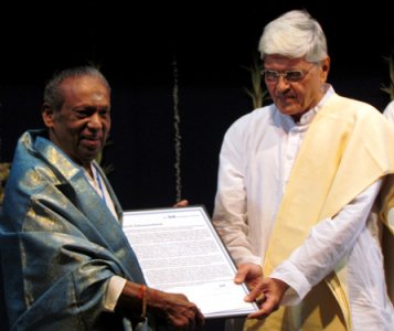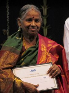 calamities. The contributions of Naralokaveeran, the general of Kulothunga Chola I, were extensive though unfortunately not well known. He constructed a hall for recitation of Tevaram hymns and engraved the hymns on copper plates. Bharati sang a few verses on Naralokaveeran that she had set to music, followed by Roja dancing to “Natanam Adinar” sung by TN Sharanya (her disciple who also did nattuvangam). The recital ended with a Manikavasagar hymn sung as a mangalam. G Vijayaraghavan on mridangam and R Kalaiarasan on violin completed the versatile music ensemble. It was indeed a pleasant evening of soulful music, elegant dance and informative prose. Chidambaram being an akasha kshetra, Chitra, Roja and the vocalists were in blue saris! The guests of honor for the evening were eminent musician R Vedavalli and dance gurus the Dhananjayans. On day two was the much awaited award ceremony. The Sruti Foundation instituted the E. Krishna Iyer Medal in 1989, to be awarded to an individual or institution who has made a significant contribution to the preservation and promotion of Bharatanatyam traditions. The first recipient was Kamala Lakshminarayan and the second was Kalakshetra. The Medal is presented every alternate year. The Vellore Gopalachariar Award instituted by mridanga vidwan Vellore Ramabhadran, in memory of his father Vellore Gopalachariar, is given to a deserving musician every year. Editor-in-chief V Ramnarayan said, “I stand before you today as the editor of a unique magazine as it enters its 30th year because its founder-editor Dr. N Pattabhi Raman took the foolhardy step of plunging into serious performing arts journalism in October 1983, amidst many a dire prediction of its early demise. He and his devoted band of colleagues and successors have kept it going against heavy odds for nearly three decades, without sacrificing the commitment to quality writing with which it started. Pattabhi was able to collect around him a whole lot of talented people devoted to writing on the arts.” Ramnarayan commended each artiste featured on Sruti covers as torch bearers of a great artistic tradition. He also saluted the many personalities associated with Sruti including PN Sundaresan, PN Venkatraman, S Rajam whose paintings and columns on music have enriched Sruti, cartoonist Sarathy, naturalist M Krishnan, T Sankaran, N Ramanathan, Manna Srinivasan, Sunil Kothari, Leela Venkataraman, V Sriram, KS Kalidas, Vamanan, Nandini Ramani, Sujatha Vijayaraghavan, Gowri Ramnarayan, Sulochana Pattabhiraman, Lakshmi Devnath, who had contributed over the years to the scholarly quality of the magazine. ![]() Suguna Purushothaman The prestigious E. KRISHNA IYER MEDAL was presented to 80-year- old Bharatanatyam Guru K Kalyanasundaram Pillai of Sri Rajarajeswari Bharatha Natya Kala Mandir, Mumbai, and the VELLORE GOPALACHARIAR MEMORIAL AWARD to eminent Carnatic vocalist Suguna Purushothaman by Gopalkrishna Gandhi, Chairman, Kalakshetra Foundation. ![]() Guru K Kalyanasundaram Pillai & Gopalkrishna Gandhi The award function was followed by an erudite speech by Gopalkrishna Gandhi. Here is an excerpt of what he said. “Sruti is 30, but it reads like a 100 year old. There is something extraordinary about Sruti. It was born with patina on it, like a new shoot with lichen on it, or a fresh print with sepia tint. Some are born wise, with minds developed beyond their age, like Pattabhi Raman was born with a fully loaded microchip of music in his mind. We are celebrating all of Sruti 30 in Pattabhi 80 and all of Pattabhi 80 in Sruti 30. Sruti will remain ever fresh even when chronologically 80 or 100 and will continue to be regarded as the senior journalist of the art world. Sruti has the dilemma of being new but sounding old or being young and seeming ancient. It may have to offend others but defend itself. Sruti has a mandate to hear and see judiciously and not judgmentally. In Sruti’s discriminating readership lies its strength. Each issue is an archive in the making and opens new eyes on an ancient scene. Sruti should remain on the high perch Pattabhi placed it on, then stablised by Ramanathan and now Ramnarayan has infused new energies with his sensitive editorship.” There was thunderous applause! The awardees expressed their thanks briefly. Guru Kalyanasundaram called Gopalkrishna Gandhi’s speech a beautiful margam in itself. His elder brother Mahalingam Pillai had also received the E. Krishna Iyer Medal. Hailing from a family that has been devoted to dance for 300 years, Guru Kalayansundaram is an 8th generation artiste. “Banis may be different but dance is the same. E. Krishna Iyer made many sacrifices to put Bharatanatyam where it is now and I am honored to receive a medal in his name.” Saying so, Guru Kalyanasundaram handed over the purse given to him by Sruti back to Sruti as his donation. Suguna Purushothaman said she started singing for the love of it, but to be recognized for it and bestowed this prestigious award meant she must have done something right! ![]() K Gayatri, Suguna Purushothaman