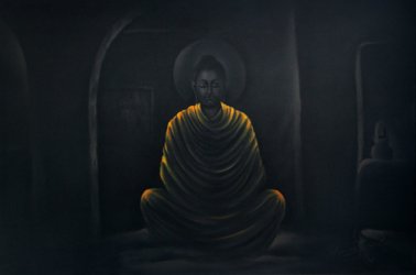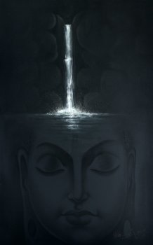 From Divine Light to Divine Darkness - Padma Jayaraj e-mail: padmajayaraj@gmail.com Photos courtesy: Prince Chand November 5, 2012 The painting exhibition DIVINE DARK (Jehangir Art Gallery, Mumbai, Oct 10 15, 2012) is a milestone in the trajectory of the artist Prince Chand, in search of light. For the artist, known for his Divine Light paintings, the shift in theme as well as the choice of colour is a turning point. The very name of the series sounds like a contradiction. But, truth often resides in the heart of contradictions. The study that features the Buddha either in the focus or in the background is done in shades of deep grey and the colour connotes different levels. Dark stands for mystery, darkness as the womb that carries light. The figures are reminiscent of the temple art of rock-cut caves in ancient India. Here is a contemporary effort to transform age old cultural technique both in form and theme as if what is contemporary were renewal of our hoary tradition. The exhibition is dedicated to the memory of an art lover, late Kantilal Gala who provided space for Prince Chand, a self taught artist, in his gallery. It began with a dream I had once of the Buddha standing on a river with light passing through his body... Ever since, for the past 12 years, I have been trying to capture light and ended up with creating the Buddha images, the artist recalls. Those 12 years for the artist was a period of study as well: reading of the Buddhist lore and visiting cave temples like the Ajanta and Ellora. The period saw experiments with colours too that finally decided in the binary dark and light. Each canvas in the upstairs hall of the gallery was a mesmerizing depiction of the Buddha....each a different metaphor, linked with nature or suggestive of myths or age-old thoughts.