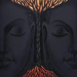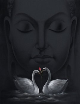 The painting of the two snow white swans with the lotus bud in their midst, the Buddha head like a shadow in the background, sets the tone and tenor of the series, with the ancient philosophical text embedded into the paintings. Oil on canvas, the god-head of the Buddha is seen as a reflection in refracted turbulent waters. In greyish white and black, the painting depicts the power of spirituality over the churning of the mind and thoughts. The doves, with the Buddha in the background, is the message of peace, while the painting of the book in front of the Buddha image depicts the wisdom and legacy that he left behind for humanity. The Buddha seated in meditation with light falling from behind is a picture of serenity itself. The tree in different forms as part of the god-head recalling the Bodhi tree is a recurring feature in the series, hinting at Enlightenment. At another level it stands for nature where the Buddha is an earthly replica of a fused whole. The waterfall that remains becalmed in the lake holding the Buddha image in its undercurrents is one of the rare renderings, where nature is divinity itself. In Sanchi, the pictorial plain depicted is like the unfolding of a scroll. The concentric circle on the forehead of the Buddha image recalls Sanchi. At another level it depicts the spiritual journey beyond the whirlpool of the conscious and the subconscious mind. It is the path of Nirvana and meditation is the only tool that ancient India has forged. The waterfall recalls the Ganga captured in the matted hair of Lord Shiva. Krishna, the lord of love with his flute, the unheard melody filling the hearts, in the foreground, sends the message of love. The crown of the Buddha with raindrops frozen in time is one of the most enchanting pictures in the exhibition. In a contrasting way it recalls the gory head of Jesus Christ with droplets of blood oozing, which has reinforced an ancient guilt that crucified the Son of God. But, here, the rain drops on the serene face lost in meditation are the symbol of Pantheism superimposed on Buddhism. Divine Dark is a narrative in pictorial language. The stories evoked reveal themselves to have a deeper meaning in each re-telling, if only we could re-imagine the way in which we choose to encapsulate them. Padma Jayaraj is a freelance writer and a regular contributor to narthaki.com |