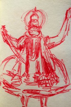 The alchemy of existence Sketch & text: Ashwini Kaarthikeyan e-mail: ashwinikaarthikeyan@gmail.com January 10, 2013 These days, there is a beautifully mysterious translucence of an other-worldly sort, hovering around our being. There is consistent opportunity in our lives to transcend the mundane. We are unique flowers weaving our own tales. We are fragrance personified. We are woven lines, in varying forms and hues. ![]() Today, we are laced in red and white, bejewelled in sparkling silver and gold! The thundering sounds from the dancer’s anklets, fills us with an adrenaline like no other! Every night fall, we listen to colourful tales about Kings, Queens, birds, flowers, bees and beasts. Magically, the heightening theatrical energy of vulnerability, sensuality and regality is whispering itself into our dreams, visions and manifestations! (In response to the Kathakali recital by Sadanam Balakrishnan and troupe at The Music Academy, Chennai, on 8th January 2013. Ashwini Kaarthikeyan is a poet, artist and Bharatanatyam dancer.) fb / artisdates.com |