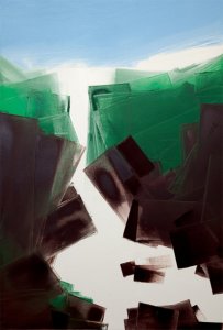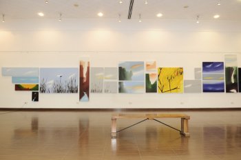 It is the aesthetics of colours that primarily keeps you drawn towards the large paintings that are abstract in form. Yet, they are so evocative that your mind coalesces with the mindscape of the artist and you journey on a parallel plain. Of course the painting of Ganesh, however abstract, sets the tone of spirituality to an Indian mind. To me, the two paintings close by in shades of blue with white splashes evoke the day time sky with white clouds floating, inducing a sense of calm in the mind. The next canvas, an amalgamation of dark-brown and deep-green against flaming yellow brings you down to mother Earth in summer hues. In the next small painting you glimpse the blue of flowing waters beyond dark shapes that suggest a rocky terrain. And you reach the watery expanse with the ‘Skyscraper’ and other studies in different shades: the waters of the land skirted by willowing plants reflect the cloudscape. The mind gets attuned to the mood that the paintings create. Beyond the watery expanse, like a child, you reach a fantasy land of golden, ‘Bamboo Field,’ wondering whether autumn resides here. All the sunlit landscapes brighten your depressed mind taking you far from the dull routine. ‘On High’ introduces a different perspective, as though the mind zooms from the clouds to meditate on the waters down below, sheltered by the landmass in green.