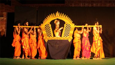 The production shone through some classic choreography, be it the inricately woven and crisp jathis by dancers of the court, synchronized dancing, the role of Indra played with masculinity, the lead role of Nahusha elevating in expressiveness, the supporting characters doing their bit to the right extent. The transition from myth to society was the icing on the cake with a pictursque vision. It was a thought provoking use of a prop in the form of a palanquin showing Nahusha’s anxious journey towards Sachi Devi, Indra’s wife. The scence was flawlessly executed by dancers working in tandem to create a feel of a wonderful journey. Classical dancers came out in new avatars to the fullest to give some powerful natural expressions in the later half. Music was very evocative and the transition from the classical was made effortless through some aptly fitting heartwarming folk tunes. DSV Sastry deserves credit for his musical score, able management of the orchestra and his soulful rendering along with an equally powerful Padma Sastry. It is never an easy task to mount a production of this scale in an institutionalized set up with an entourage of 25 students, but for the spirit of the students and an undying passion on the part of the conceiver Pasumarthy Ramalinga Sastry. As rightly put by the Vice Chancellor of the University, “Take a bow, you deserve it!” |