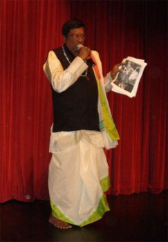 Lec-dem on Annamacharya - Mala Mohan June 30, 2013 Under the aegis of Encee Academy of Performing Arts, Usha Raghavan (Director of Kalasagara, UK) along with her senior disciples presented a delightful and enlightening lecture / demonstration on the ‘Life and Kritis of the 15th century poet saint Annamacharya’ on the 23rd June 2013. The group performed to a packed audience at the Patidar House, Wembley. The Chief Guest for the evening was Kamisetty Srinivasulu, scholar and director of the Annamacharya Project TTD, Tirupati, who spoke eloquently about Saint Annamacharya and his immense contribution to the world of poetry and music ![]() Kamisetty Srinivasulu ![]() Usha Raghavan Tallapaka Annamacharya is a prolific composer of the 15th century who composed keertanas in praise of Lord Venkateswara. He is said to have composed as many as 36,000 keertanas of which only about 12,000 are available today. His songs are classified into the Adhyaatma (spiritual) and Sringaara (romantic) keertanas. Usha Raghavan chose 9 exquisite compositions depicting the Adhyaatma philosophy and choreographed them in the most befitting manner, some of which she performed as a solo (Enthamatramuna, Muddugare Yashoda and Ksheerabdi). Usha commenced the lec-dem with an engaging Thodayamangalam that combined the lyrics of many of Annamacharya’s compositions strung into a garland of different ragas and talas (Ragatalamalika). What was most appealing about the lec-dem was the detailed explanation Usha gave of the lyrics of each of the songs that were performed. It was further enhanced by an illustration of the emotions captured in each of the items by her disciples. This was then followed by the actual performance of each song. The other popular songs that were chosen for the evening were Sriman Narayana, Dolayam, Bhavayami gopalabalam, Indariki and Brahmam Okate. The composition Bhavayami Gopalabalam was a solo presentation by one of Usha’s senior disciples, Jayashree Sundaresan. Her performance was replete with graceful movements and immaculate abhinaya. Another neat and pleasing solo performance was that of Meena Rajagopalan who chose the composition Indariki. The rest of the songs were performed as a group with perfect coordination. ![]()