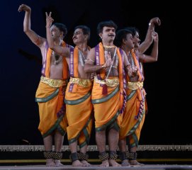 Articulate Ability The finale was a Bharatanatyam presentation by the visually challenged artistes of Articulate Ability featuring 5 males and 6 females – Buse Gowda, Guruprasad, Taraka Ramulu, Satish Rao, Sivaswamy, Suma, Sowmya, Latha Mani, Gulab Shah, Pallavi and Rashmi. They are being trained under the loving guidance of Mysore B Nagaraj and Suparna Venkatesh. In the first item Poorva Ranga Vidhi, the male performers conduct a ritual sprinkling water to sanctify the space and then go around the stage invoking the guardians of the eight directions. The perfect placement of objects, superb coordination and synchronized movements marked this item. They then presented Dwadasha Stotra, an ode to Ganesha extolling the various attributes of the elephant headed god. Faultless crisscrossing of stage and beautifully formed stills earned them spontaneous applause of the appreciative audience. The female dancers then performed an item on Kundalini Shakti. Dancers stood one behind the other, fanned out like a five headed cobra, performed mini solos to a string of jathis, fell back into straight lines or performed in circles in fluent movements and accurate positions. The item on martial art with the male dancers wielding sword and shield was mind boggling in its execution, the performers even clashing swords with each other with precise, geometric moves. The audience could not stop applauding. The girls concluded with a thillana in tribute to the musical instruments used in dance. Felicitating the artistes, dancer Lakshmi Gopalaswamy said, “I performed a thillana with them last October. I thought it would be easy and I did not need much rehearsal but I underestimated their capacity. Just by hearing, they could point out any mistake in my steps. I was fascinated by the way they took their positions and made perfect formations. It was a revelation. I have been so inspired and amazed by them.” Mysore Nagaraj did a good job as the evening’s anchor with clear description of items and regaling us with brief anecdotes about the background of the visually impaired dancers. The organizers could have planned in such a way that the Articulate Ability were featured earlier in the evening rather than the last act as members of the audience started leaving by 9pm. If more performance opportunities come its way, the group will be able to show many other people across the country that visual impairment has not deterred these wonderful artistes from following their passion for dance. As the representative from sponsor Canara Bank said earlier in the evening, learning dance and music is a great stress buster and they would continue to remain committed to supporting the arts. ![]() ![]() Sanjay Shantaram, Shivapriya ensemble The final evening of the festival started with a long varnam on Lord Shiva, “Aadum deivam arulvaai” composed by Kameshwaran in Kalyani raagam, performed by Sanjay Shantaram and 14 female students of Shivapriya ensemble. While the ensemble came together for the lively nritta sequences, Sanjay shone in the solo dramatic abhinaya section depicting the story of ‘Bedara Kannappa’ and also in the brief depiction of the argument between Brahma and Vishnu, with Sanjay doing Shiva’s role. The exuberant choreography involved interesting line formations, lots of leaps and twirls with the dancers maintaining their balance. ![]() Priyadarsini Govind
