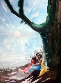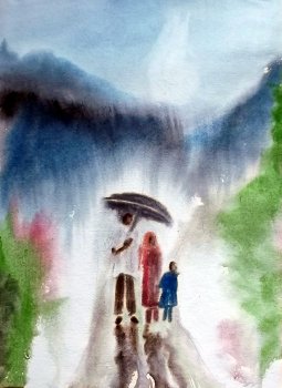 FAMILY IN RAIN, water color, is transparent like the rain itself. So is the painting of ‘The women who gather firewood and coconuts from rushing waters.’ The title, in its simplicity is “Rain, rain, go away…” But I hear the picture singing… “Rain, rain, come again…” “It is a sight that I watch in my neighborhood year after year,” says the artist. Perhaps the climatic turmoil and the recent water scarcity in Kerala pushed me to interpret it as the women longing to be in the waters. ![]() Family in rain ![]() Lovers
