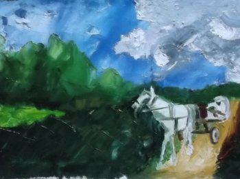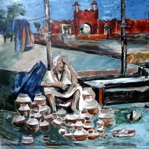 Just like the rain, moonlight rains in some of his paintings. Again it is water color on handmade paper that creates the illusion of a moon soaked landscape. Here the tool for painting moves from brush, finger tips to knife. The picture of the lovers hidden in the moonlight, evokes the saga of Radha-Krishna celebrated in Indian arts. And here is another visual that is culled from life: a couple in the dark night under the starry sky, a romantic scene from real life. “They are a doctor couple whom I know who move on in life celebrating love and romance for more than a decade of their married life.” Love rains unseen! RAASALEELA is an interesting version of the original myth. In a forest glade with the river in the backdrop, music rains. As the unheard melodies of the flautists rain celestial raagas, the gopikas come down to them oblivious of everything except love. THE MONSOON CLOUDS is a skyscape filled with the harbingers of rain. It is such sights that make the peacocks dance. The old man in the inset has a face awash with the joy of rains, the memories of the many monsoons of his life…and I recall my memories of the many monsoons of my life. ![]() Horse-drawn carriage, a window view ![]() The pot seller If these are the facets of Kerala, there is the picture of the monsoon in Rajasthan. THE POT SELLER and THE FRUIT SELLER are women from other states united by the theme of the monsoon rains. As we stood in front of a horse against the backdrop of wet green and dark sky, the artist fondly recalled a prancing horse that disappeared from his window view during a train journey through Goa. Green and blue dominate the paintings. But MONSOON BLAST is streaked in red as it suggests the fire caused by lightning. There are slices from social life as well. THE ANTIQUE DEALER lost among his collections is a character like the village idiot in certain places. THE RUINED FATHER speaks of the agony of a father with a grown up daughter in a dilapidated hut in today’s inhuman social reality. The underlying metaphor of the monsoon rains accentuates the theme of the show. In the title MAZHAKAPU, the rain is conceived as an ornament signifying marital and religious rituals in Kerala. The different meanings of the word in Malayalam suggest its many dimensions, fertility as well as mystical. The show (June 10 to 14, 2013) rose from its mundane facet to the spiritual heights as all arts is bound to take you. Padma Jayaraj is a freelance writer on the Arts and travel and is a regular contributor to www.narthaki.com |
