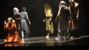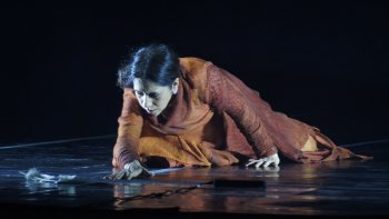 The performance began punctually with no frills, no lamp lighting, no introductions and no chief guest. The first part of the production, ‘Knotted’ was scheduled for forty minutes. The performance began with the beating of the drums and the dancers running across the stage. They were falling and running as if to save their lives. Then the actions of Aditi symbolized the flames of fire. Further, she enacted the three principles of speak no evil, hear no evil, see no evil. This was followed by nritta by the group of dancers. Suddenly there is thunder and a feather drops. Aditi wriggles on the floor to catch it, but it moves away, eluding her. The dancers then lay down, falling and slithering, piling on top of each other. Next, Aditi sat with her back to the audience, knotted up in a foetal position. She tries to open her limbs, and closes them again many times. This was followed by some violence and fight, turmoil and lastly, the act of muffling the voice. The music composition of the piece was by Ish Sehrawat and Diffused Beats (Sound Reasons), which was very effective in showing the dark side of the theme. The recording musicians were Mohit Gangani on tabla, Ashish Gangani on pakhawaj and Saskia Rao De Haas on the cello. Costume design was by Kimie Nakano, costume realization by Sandhya Raman and script by Vani Subramanian. Stage design was by Manish Kansara and light design by Fabiana Piccioli, technical coordination by Sander Loonen and research by Ragini Pasricha and Aditi Mangaldas. The stage design of the panels in the background, according to Aditi, “was more about our inner landscape. The scratches or ruptures on our inside and outside, the ruptures through which both hate and love can flow out, depending upon what we let out.” The colour and the texture of the panels signified the barren and the brutal texture of our insides without any foliage or flowers of gentler emotions. The dancers represented the thoughts and emotions that burst on the terrain of our minds. The colours of the costumes - burnt sienna and dark green - probably showed the emotions that charge and ignite us and those that are dark and brutal. These emotions run awry, flame and charge. The feather, according to Aditi, is the “end of freedom. A small change in one place can create havoc in another. An innocent thing like a feather can create devastation if brutality rules our within.” Perhaps the feather represented the fragility and unimportance of our pursuits. Aditi’s actions showed how elusive these are. We crave for them while these material things elude us. The slithering bodies, according to Aditi, are “our inner emotions in constant half embrace - the brutal and the human. Do we honestly see these interplays?” The dancers wriggled and slithered on the floor, finally piling on top of each other in a heap. The mind is the battlefield for these emotions and the tug of war perpetually goes on in each of us. The following actions by Aditi of knotting and opening her body showed how knotted our thoughts become, trying repeatedly to break free from each other, but then again getting bogged down in the quagmire. Aditi was right in saying that we may not like what we may see, since its import of the turmoil and violence within us is not a pleasant theme to be portrayed.