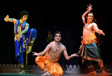 Nayaka-Nayika Festival - Poornima Gururaja e-mail: kalasindhudance@gmail.com October 7, 2014 The inaugural lamp placed at an unusual location in the back center of the stage, at the outset caught the attention of the audience and the guests of honour, Manju Bhargavi and Mysore V. Subramanya at the opening of the two day Nayaka-Nayika Festival conceptualised by art consultant Usha Rk. Six talented dancers opened the festival with a vibrant pushpanjali on an aesthetically pleasing stage set by Bangalore dancer Sathyanarayana Raju. Usha Rk’s brief and accurate compering introduced and walked the audience through the first day’s concept, Navarasa Nayaka. The concept was developed around the theme of Lord Shiva and his attributes. Sathyanarayana Raju portrayed a sensual yet restrained and mature sringara aspect of the lord Shiva which is quite rare. Impressive were the lyrics “Jaya Sundari, talavakilu teeyave, jagadeeshwarude komma” penned especially for the episode by vocalist D.S Srivatsa. Shiva lets his matted locks loose to encircle and bring close his Parwati, who finds herself entangled and up close in front of her lord is enamoured to see this romantic form of Shiva. Sathya’s depiction of this was restrained and dignified. Following this was Surya Rao’s portrayal of karuna through the story of Bhakta Markandeya. Surya opted to tell the story through the medium of Kuchipudi and movements of Bhagavatha Mela Natakam. His performance could have used a bit of subtlety when it came to portraying Markandeya as a child, and over the top vatsalya did not sit well on lord Shiva. Pavitra Bhat from Bombay told the story of Kama Dahana, for roudra rasa. His execution of the arrows Kama aims at lord Shiva were more impactful than the actual burning down of the god of love. ![]() Pavitra Bhat, Sathyanarayana Raju, Surya Rao