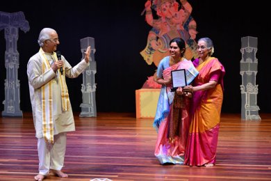 The seven students who danced the varnam did justice to Dhananjayan’s seasoned choreography in Kalayani raga “Gokulabala.” Ramesh Babu thrilled the audiences with his jathi plays. In fact he carried the varnam forward with his spirited percussion support. However many times you witness it, one does not get tired of the sanchari bhavas of Krishna leela, designed by the maestro for rasanubhava of the audience. The maestros gave in to Rathika’s request and came on stage to present two items. Dhananjayan left the audience sighing when he danced as Nandanar in “Varugalamo aiya” displaying the intense pathos of the devotee who is directly pleading with the Lord who is in his heart, but in reality, divided by a chasm. Shanta on the other hand decided to use a messenger and chose the cuckoo bird with “Kuyile unakku ananthakodi namaskaram.” Her style was more subtle bhava rendition sending messages to Kumaran. As Maanji and Kambhoji pleasantly wafted, the dancing couple delighted the audience despite the lack of makeup and costumes. The margam included Rathika’s own choreography in the navarasa nayakis and Koneshwara kauthuvam and concluded with the Kapi thillana, once again a Dhananjayan choreography. The students were more nervous performing in front of the paramagurus than facing the five hundred and fifty strong audience. The parting message from the maestros was that, anything worthy will last always. |