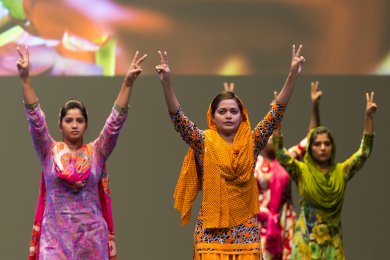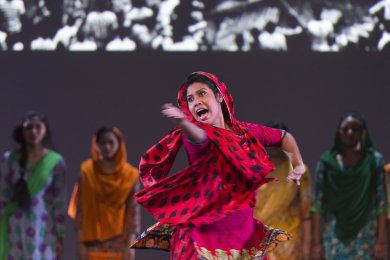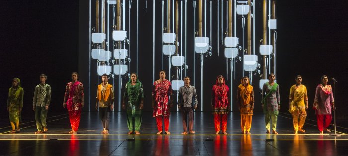 Made in Bangladesh: Stringing tales of exploitation - Sulagna Mukhopadhyay e-mail: sulagna64@gmail.com Photos courtesy: The Goethe Institut, Kolkata February 6, 2015 It was 22 January 2015. Spectators thronged in front of the Science City Auditorium in Kolkata to watch a production by Helena Waldmann. As they entered the auditorium there was a projection going on without any sound, showcasing the workers working in a sweat shop. As the curtain rose the sound of workers working in the factory could be heard. This gradually phased out with the appearance of twelve dancers standing in a straight single file and tapping their feet. Helena Waldmann, the German choreographer and theater personality was moved by the plight of the stoic garment workers of Bangladesh who earn a meager wage every day despite toiling hard. The immense competition in this world forces them to work almost 24 hours a day without any proper break for lunch or even to use the rest room. Waldmann found Kathak as the effective mode of expression for her thoughts towards these people. After conceptualizing the idea, she co-choreographed this piece with Vikram Iyengar of Ranan , Kolkata.