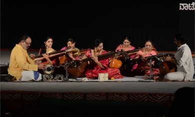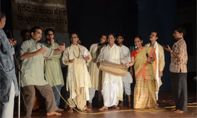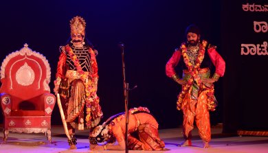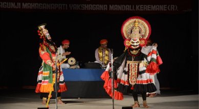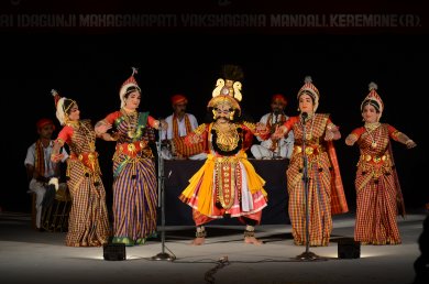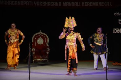 The evening saw the customary session wherein the Idagunji Mela felicitates artists, art patrons, journalists, organizers, etc., as a means to acknowledge their efforts in promoting art, a very well thought of initiative to keep the stream of art flow to the discerning audience throughout the state of Karnataka by encouraging the contributors to the art world in general. These sessions also kept the audience warmed up to receive the cultural program of the evening with eagerness. The second evening’s cultural events saw in the beginning a Bharatanatyam and Kuchipudi performance by Anuradha Vikrant, Shama Krishna and Divya Ravi of Ananya Institute, Bengaluru. Next was the much awaited natakam by the Melattur Bhagavathamelam - ‘Shri Krishna Jananam and Kamsa Vadham.’ The Melattur natakam being featured for the first time at Idagunji was led by S. Natarajan and his brother S. Kumar. The natakam with lively music and details of events leading to the birth of Shri Krishna, his growing years up to the killing of Kamsa performed with lot of verve and sincerity by all the members of the illustrious Mela from Tamilnadu went on well up to midnight. The importance of a script, rendering with a full fledged team of accompanists, props, rich costumes did speak a lot about the seriousness and bhakthi with which the Melattur Bhagavathamelam go about their natakams, akin to an offering to the almighty. February 8 ![]() Seminar on Yakshaganams ![]() Bhakta Prahlada The seminar session in the morning featured probably for the first time primary artists from all three streams of Yakshagana talk about the traditions of Karnataka Yakshagana, Kuchipudi Yakshaganam and Melattur Bhagavathamela. S. Natarajan of Melattur shared a video of ‘Prahalada Natakam’ which is performed only at the precincts of the temple at Melattur, that too during the annual festival of the temple. He also explained how the natakam is structured and enacted by the Mela for the past couple of centuries in the recorded history of the Mela. Tadepalli Satyanarayana Sarma of Kuchipudi Bhagavathamelam spoke eloquently about Kuchipudi Yakshaganam and demonstrated with the assistance of one of the present Kuchipudi Yakshaganam’s stalwart, Vedantam Venkatanagachalapathi Rao to the music of D.S.V. Sastry, an exponent of Kuchipudi Yakshaganam sangeetha sampradayam. The participants of the seminar were more enlightened about Yakshaganam at the end of this presentation. R. Sridhar of Panchamavedam Foundation, Bengaluru, implored the three streams of Yakshaganam to come together to take proactive steps to preserve, promote and propagate the Yakshaganam tradition by having the same listed as an Intangible Cultural Heritage (ICH) of our country under UNESCO. In the transitional stage of any community based ICH like Yakshagana, the need is for ensuring documentation, various socio and economic welfare measures for the sustainability and economic viability of the art and artists, cultural and heritage tourism for propagation and promotion. This initiative which requires the active participation of all the stake holders were brought out lucidly in the informative presentation, though a lot needs to be done in this regard. Dr. M. Prabhakar Joshi, a Yakshagana scholar and writer from Mangalore, spoke about the current situation of Karnataka Yakshagana, and also welcomed the proposal for ICH jointly by the three Yakshagana streams. After the teaser of the evening’s Kuchipudi Yakshaganam ‘Bhakta Prahlada’ shown in the demonstration of the morning seminar on ‘Traditions of Yakshaganam,’ the high level of expectation from the audience for a wholesome entertaining evening was very much evident. They were not disappointed as the performance of the youngsters of the Kuchipudi Bhagavathamelam which has a recorded history dating back to several centuries was really exhilarating. The very well known Narasimha avatar was dealt with lot of dramatic, poignant, gripping narration and above all the melodious spirited singing by D.S.V. Sastry did assist the group ably led by Vedanatam Venkatanagachalapathy Rao who essayed the role of King Hiranyakasipu to a nicety which was thoroughly enjoyed by both the elders and youngsters in the audience. ![]() Sattriya performance ![]() Karthaveeryarjuna Kalaga This was followed by a Sattriya dance recital by Sattriya Kendra of SNA, Guwahati, Assam. The Sattriya dance evolved from the Ankiya nat Bhaona, the Vaishnava theatre introduced by saint Srimanta Sankaradeva with both vigorous and graceful component of dance was later pursued and practiced as part of various prayer services in the Sattra institutions. The first item was Krishna Vandana with Sutradhari dance in Suhai and Dhanasri raag set to ek and rakta taal. This was followed with a Jhumura dance, abhinaya in Bargeet and Chali dance, a lasya section of the Sattriya tradition. The theme of bringing together all the three streams of Yakshaganam for the benefit of the audience to appreciate their similarities as well as uniqueness was complete with the presentation of Karnataka Yakshagana (Badagu tittu) ‘Karthaveeryarjuna Kalaga’ by Sri Idagunji Mahaganapati Yakshagana Mandali, Keremane, featuring Chittani Ramachandra Hegde and Shivananda Hegde. It was watched by the Sunday evening crowd with delight, savouring each and every moment of the Yakshagana which went beyond midnight as is wont when it comes to Yakshagana plays. February 9 ![]() Seminar on Sattriya ![]() Suma Sudhindra and group ![]() Vyjayanthi Kashi & Prateeksha Kashi The evening’s cultural event saw for the first time during the festival, music recitals. Dr. Suma Sudhindra, Bengaluru and her group’s veena recital was followed by Kabir Gayan by Shri Prahlada Tiphaniya, Bhopal. Dr. Suma Sudhindra’s recital featured a couple of Saint Thyagaraja’s compositions, namely Samaja Vara Gamana in Hindolam ragam set to adi tala and Manav Alakinchara in Nalinakanta ragam set to adi tala which wer