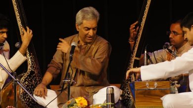 Spring in the air and in the arts - Shveta Arora e-mail: shwetananoop@gmail.com Photos: Anoop Arora May 6, 2015 The spring in Delhi is a little prolonged this year as the rains have not let the temperature rise. The flowers in the foyer at Stein Auditorium at IHC enhanced the pleasant ambience of spring. The occasion was Sur Shringar - a festival organized by Yogdan, an NGO which provides livelihood and education to the underprivileged. The artistes of the evening, Madhup Mudgal and Geeta Chandran are masters of their craft and proved that despite performing in front of a packed house, their immersion in their performances and its selfless pleasure is complete. ![]() Pt Madhup Mudgal