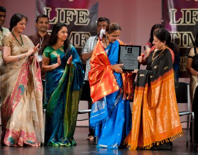 Viji Prakash honored with Soorya Lifetime Achievement Award - Anitha Nagendra Photos: Kanagamathy July 7, 2015 It was a colorful evening filled with dance and music gurus, art patrons and hundreds of dance and music students to felicitate one of the distinguished teachers of Indian classical dance in USA. Soorya Lifetime Achievement Award instituted by Soorya Performing Arts had a purse of $1000 and a plaque. This year’s awardee was Guru Viji Prakash, artistic director of Shakti Dance Company of Los Angeles. ![]() Viji Prakash receiving award