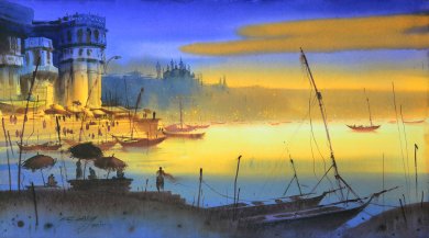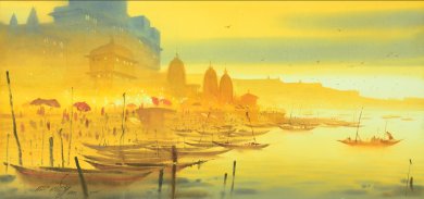 Ganga Lahari - Padma Jayaraj e-mail: padmajayaraj@gmail.com Images courtesy: Ganesh Hire September 5, 2015 Ganga Lahari, a series of water colors by Ganesh Hire (11th Aug to 17th Aug 2015) in Jahangir Art Gallery, Mumbai, was a stunning display of the sacred river that runs through the cultural landscape of India from times immemorial. The paintings are gateways to the eternal dimensions of scenic beauty. They invoke contemplation that creates profound pleasure and awareness of the higher aspects of Nature. The salient feature of the exhibition that attracts the viewer is its evocative eminence. To the human mind, riverscapes stir up nostalgia that rise from the collective unconscious. It takes you down memory lane to the beginnings of evolution. The first spec of life rose in water. For millions of years, these water bodies were home for us. The Dasavatara testifies to it. Water is life, mobility, purity, and sanctity. Ancient civilizations rose on the river banks. In India, river Ganga nurtured a great civilization, the Vedic culture, and its unique philosophy. The artist reared on the banks of Godavari, whose artistic journey began from its banks, pays his tribute to the ultimate river to the Indian consciousness. Intoxicated by its pristine beauty, he paints the Ganga bathed in celestial light, flowing in graceful choreographic symphony. The exquisite patterns, its synchronous rhythms, the lucid orchestration of colors, the lyrical charms, and the aesthetic lure that govern the series, are rooted in the artistic perceptions of a river that give it divine dimensions. True, the paintings appear like cinematic visuals where realism dominates. But, on closer view, it is the magical realism that takes the paintings to nobler heights. ![]() The exhibition is curated to cater to the sensibilities of an Indian mind. The series starts with the offering of lamps, the Ganga arati, and a common sight in many temples on its banks. It is not just the tribute of the artist, but the homage of the people of its plains, nurtured by its waters: a culture honoring its divine mother. The marvelous dimension in the foreground is a contrast to the background. Colors are orchestrated in such a way that an azure tone dominates to give the river its innate serenity and the flowing waters a rhythmic chant. The luminosity of the white has the centrality which suggests both purity and spirituality. Blue mountains stretch far beyond. The horizon above dissolves into a soft blur. The suggestion of ancient structures in silhouettes on either side completes the composition with the humanscape in the margin pointing to the role of the river in the larger scheme of Nature. The huge painting is an introduction to all the aspects of the Ganga.