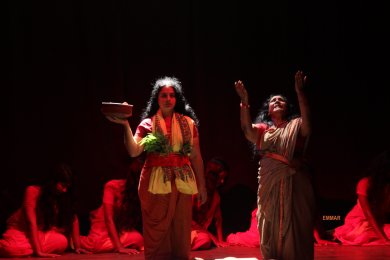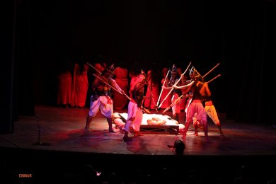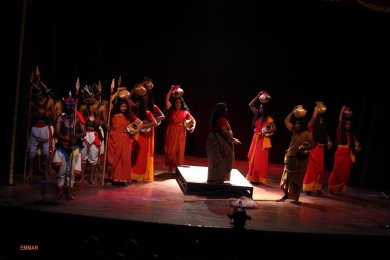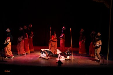 Booming drum beats resound, the curtain rises; submerged in blood-red light the stage reminds you of the afterglow of a burning ghat. Soldiers clad in village dress code with their spears swaying in stylized dance celebrate the victory of war. As they move away, we see the specter of a woman, prostrate as if on a pyre. The captive women and the soldiers form the chorus. The central character is the Queen mother surrounded by the widows in mourning. Evoking Gandhari Vilapam to an Indian mind, the play moves on to narrate the tragedy of her family within the larger context of her country. The cause of war is the abduction of woman, an incident like what caused the Trojan War or the war between Rama and Ravana. And the play deals with the theme of moral degradation from another perspective. The story unravels through folk songs, dialogues and moving tableaux in measured steps. The play does not have a background score. The soundscape is built by the rhythmic movements of dancing steps in sync with drum beats, and spears hammering on the ground, punctuated by silences in between, which create a special effect. Oppari, the ceremonial lament of rural Tamilnadu cascading in folk strains is the signature song. Music fathoming the depth of the ineffable is the salient feature of the play. Performance in stylized dance has an aesthetical appeal like abstract painting or pure music. What is gruesome in realistic representation acquires intensity, like a scalding memory. The props in different contexts gain different meanings. The spear and the earthen pot attain sexual connotations at times. The earthen pots with a painted eye stand for skulls in the battle ground. They are the sacred pots used in ritual ceremonies. They are the breasts of the mother that feed and nurture babies. As water carriers perched on the heads of women who walk long distances, they have carried folk memories of war long before recorded history. ![]() The play starts when the widowed women, captured by the enemy soldiers come to the Queen mother. They ask themselves what next. And with the Queen mother they bewail their fate. That the women are the spoils of war to be enjoyed by the victorious is a fact down human memory. The tableau of a young woman cast as if for the sacrificial altar is led by soldiers. She is the eldest daughter, Princess Thulasi, a saintly woman as her name suggests. The arrogant winner is determined to make her the wife of his son. She has come to ask for the blessings of the Queen mother on her way to the forced rite. In a flashback, the Queen recalls how Nature burst into flowers when her baby was born; how she wanted to lead a hallowed life like the legendary Princess Meera in love with Krishna. Yet human spirit succumbs to calamity. But the Princess is above the common run of weak humans. In divine frenzy she predicts her own death which will suck in the death of the Prince as well. The theme of surrender is reinforced by the primordial ritual of human sacrifice. The second daughter is led by the soldiers as a sacrificial lamb. She needs to be sacrificed for the victorious procession of the conqueror returning home with the spoils of war. The tragic story of Iphigenia in the Greek epic is but a continuum. Now comes the wife of the dead Prince. She is holding her infant boy, the one male left alive in the land. The Queen mother finds hope kindling as she dreams of the baby growing up into a brave man who will one day avenge the wrongs done to them. But his mother gives the Queen a rude shock. That she too has to reconcile to the fate of any other woman of a defeated land. Sexual violence is reiterated with the spears moving in sync with the moving feet producing a different rhythm. Now the baby is in the focus. The soldiers bring the order of the King to kill the baby Prince. Such inhumanity is too much to bear. From the ashes of defeat the Queen Mother rises in her elements. She does not mince her words. She cannot bewail her fate. That human spirit succumbing to calamity is the weakness of the soul. She spits out the bitter truth that killing a baby is not an act of bravery in war but cowardice. Yet, madness heeds not reason. The spears fall on the baby…. The ceremonial lament flows.