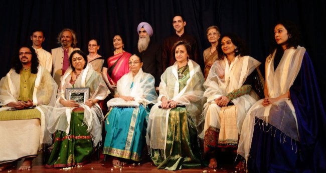 Pic: Saroj Kumar Mishra There are no flashy shawls but muted and understated off-white stoles. Each awardee gets a 5 line citation, carefully compiled by Elisabeth Khokar, co-publisher of attendance yearbook and dance mentor. Each awardee gets 15 minutes to perform, were they to so chose, or a short film on their work is shown. Mayuri and Madhuri Upadhya’s dance company Nritarutya showcased Matysa, a recent work and it wowed all present. Despite limitations of AFB's small stage and basic lights, the group acquitted professionally, Aishwarya Nityanand's Natanam Adinaar, a Shiva Kriti, was done with aplomb. Here is a dancer who brings old-fashioned beauty of the form with high standards and perfection. She was selected by India Today as top of under-30 talent in India last year in a nationwide survey. Both Sheejith Krishna and Gowri Ramnarayan came without film of their work due to floods and time constraints but the same AFB audiences had seen their production Sarpa Sutra a few years ago, on the occasion of attendance awards 2012. Guru Padmini Ravi spoke about her journey and the short dance she did was minimal and informal. She has trained many students of note in Bangalore and organized the Bangalore Habba, a popular mass event for some years. Guru Radha Shridar was the only awardee who made a proper acceptance speech. Some interesting features of the function were pada puja by budding dance students of Sampada Pillai, Tushar - Puja Bhatt and Madhulita Mohapatra. Another feature was young upcoming talents conducted the evening while chief mentor Ashish Khokar stayed in the background. “This is the best way of teaching and mentoring,” he holds. Thus, bright Odissi talent Meghna Das welcomed all and introduced the evening. Kathakaar Tushar Bhatt handled lights and tech room with Aslam of AFB. Dancer Praveen Kumar brought the Nadaswaram party. Nandini Mehta of Nadam brought plants and flowers for awardees. Two patrons Vinay Shinde and A. Narayan hosted the dinner. It was thus a coming together of so many good people who love dance and thus supported this initiative. attendance award function was also graced by iconic superstar Vyjayantimala, who accompanied educationist and art-patron Dr. Vimala Rangachar, who was last year’s awardee. In all, the event was meaningful and memorable. |