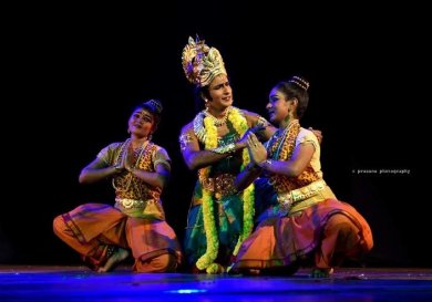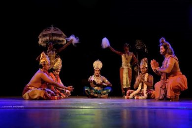 The role played by Anjaneya was so vibrant that many could experience kinaesthetically something similar to the physical sensations of the artiste. Though one felt excess of yellow on cheeks, to enhance the protrusion of reddish jaws, could have been avoided. There was maturity and poise in the character of Valmiki and Vashista. The beauty was this hour long briskly paced dance drama was also spiced with sublime incorporation of sculpturesque poses of some characters with appropriate ragas like Sahana accompanying such a scene. |