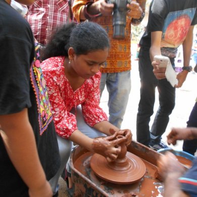 Studio Pottery in Kala Ghoda Festival - Padma Jayaraj e-mail: padmajayaraj@gmail.com February 16, 2016 The Kala Ghoda Arts Festival is a nine-day long annual event from the first Saturday of February to the second Sunday of February, in the Kala Ghoda area of South Mumbai. From its inception in 1999, the festival has grown in stature and popularity, attracting visitors and participants from all over the country. As an outsider I felt the venue to be a street mela. As I walked along, I could see the emphasis on hand-crafted wares with an eco-friendly message. Visual arts, besides children’s section and food art, are other features. The extravaganza is the promise of a cultural palate, not just for Indians beyond Mumbai but also for tourists, who flock to the venue. ![]() Pottery installation ![]() Creating a piece ![]() The iconic jar ![]() Miniature pieces Beyond the usual sights in exhibition stalls, I stumbled upon a unique setting for STUDIO POTTERY. The site showcased artifacts born of clay: from the most ancient craft to sophisticated ceramic objects and the magic of converting waste to objet d'art. The organizers give the artists a table and a small space to display their items for three days. And a number of artists, some trained, others self-taught put up their shops creating the ambience of an artists’ village. Some of the artists gave a sampling of creating an object. The thrill of creativity marked its exuberance on the faces of those who tried. FINE TERRACOTTA POTTERY displayed earthen pottery by a group hailing from the district of Bharatpur, Rajasthan. The iconic jar sat on the floor lording the miniature ones in front: an emperor of a lost world overseeing his people! It is the tallest jar that I have ever seen. It reminded me of the relics unearthed from ancient archeological sites of human settlements. A symbol of earthen pottery, it is a unique museum piece. The small assortment of earthen ware, miniature art forms meant for showcases, are beauties from the ethnic art of humanity. The group, Motilal Prajapati, Devendra Prajapatu, Tej Singh and Bhan Singh belong to the traditional artisans who are artists of the first order in tune with the ancient tradition of Indian arts. Shayonti Salvi, an artist, the product of Fine Art school, is based in Mumbai. Her pieces are ceramic ware. She has a studio where she imparts training in the art of fine pottery for students who are lovers of art and who want to pursue it seriously. Her items showcase things that people choose as home decor. ![]() Shayonti Salvi ![]() Lipi Biswas Lipi Biswas belongs to a special category of artists for whom art is their religion. Born in Thailand, she met her guru in India in 2000. She prefers to be part of a village. And she lives and works with people for whom crafting clay products is a way of life. The Asian touch in shape and style is the unique stamp of her products. I have come across many artists of many dispositions. Lipi Biswas oozes out simplicity and humility. Married to a painter from Santiniketan she is happy, living close by in a village working with and for rural folk. ![]() The best of waste From the small tables I moved to sites that showed installations. The notable one was a product made of old CDS, the best waste. Children gathered around such mega objects out of fascination for colorful beings of their fantasy world. For environmentalists it is a lesson to make beauties from cast-off useless things we call waste. The success of Kala Ghoda Arts Festival lies in giving inspiration to set up such cultural forums in other parts of Mumbai. Indeed such venues should come up in other parts of our country. Padma Jayaraj is a freelance writer on the arts. She is a regular contributor to www.narthaki.com. |