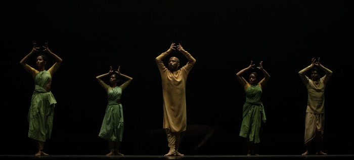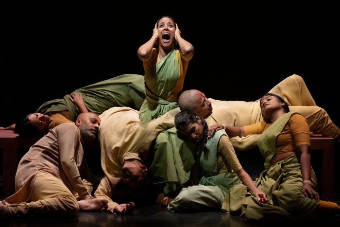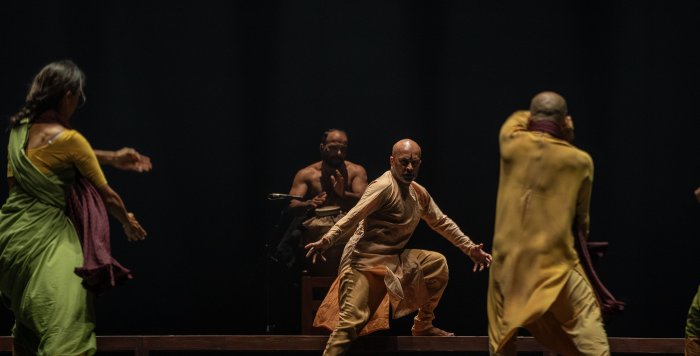The story of loss and grief, inscribed on the earth - Anita Vallabh e-mail: anitavallabhofficial@gmail.com February 25, 2025 Akram Khan's 'Gigenis: The Generation of the Earth' was performed at the Joyce Theatre in New York on February 15. The performance draws upon the immense power of the arts to illuminate the unspoken truth of women who, historically in the context of war, have borne the devastating emotional consequences of futile wars fought to plunder, usurp, and serve the insatiable greed and power-lust of a privileged few. "Gigenis" refers to a tribe of giants in ancient Greek mythology who engaged in warfare, while "The Generation of the Earth" alludes to the numerous wars fought throughout history. By narrating the story of a single woman, the performance raises a pertinent question: at what cost is the emotional persecution of women deemed justifiable? ![]() Kapila Venu (Credit: Camilla Greenwell Productions Sarfati) From the moment the curtain rises, accompanied by the percussive sounds emanating from a pitch-dark theater, the ingenious light design and soundscape skillfully draw us into a foreboding narrative. As the dancers watch, a shadow of light marking their presence, Kapila Venu, a virtuoso of Kuttiyattam, steps to the center stage. Her piercing eyes and sharp glances conjure the image of a voracious vulture scanning the battlefield littered with lifeless bodies, violently stabbed and beheaded. It swoops down to tug and pull at the entrails of the dead and holds them aloft, devouring the remains of war. Her eyeballs held in vivartita -wide open with the pupils dilating - her hands raised wide above the shoulders, holding a downward ardhamukula mudra, her tongue protrudes, its tip folded inward, she stands with her feet apart and strikes a terrifying pose that draws us into the depths of her inner turmoil- a mixture of self-loathing and the unspeakable horrors of war. In a somber posture, she, now a forlorn woman, sits hunched over, hastily etching onto the earth the chronicle of generations-long wars, lest the world forget their devastating consequences. As she stands looking faraway lost in thought a soft voice narrates: "In another time, I was a daughter, then a wife, then a mother." As she reminisces, the innocence of her childhood is played by Sirikalyani Adkoli, an Odissi dancer. The grace and fluidity of her movements reflect the purity of childhood innocence. As she is moving, the scene gracefully transitions to her married life. Bharatanātyam dancers Vijna plays the married woman and Renjith Babu, her husband and king. They move in synchrony, around and beside one another. The mellifluous rendition of Muthuswami Dikshitar's Jambupathe maam paahi, fills the air as the dancers, with one hand held across the wrist, weave a gentle motif of a bird in flight juxtaposing the theme of love and freedom against the backdrop of the song lyrics, which expresses a plea for protection and a seeking for the nectar of bliss. The scene concludes with the song Aaj jaane ki zid na karo, with the wife beseeching her husband/king not to go to war, even as he picks his weapon and walks away. Throughout the narration, Kapila Venu's protagonist fades in and fades out as witness to the memories. ![]() (Credit: Maxime Dos Productions Sarfati) ![]() Mythili Prakash (Credit: Camilla Greenwell Productions Sarfati) The next scene paints a picture of a woman across time; Vijna giving birth, Kapila Venu reminiscing the birth of two sons and Mythili Prakash as the mother to two grown sons played by Akram Khan and Mavin Khoo. After the death of the king in war, the trio confront the turmoil of choosing an heir. In a remarkably ingenious scene, Mythili Prakash holds the crown- suggested by her fingers in alapadma towards an oncoming shaft of light. Her rapidly moving fingers illuminated by its golden hue, deftly suggests the sinister allure of greed and power. Akram and Mavin intently gaze upon it. Mavin Khoo as the son chosen by his mother to be king, plays the role with unassuming power. His performance, in movement and stillness was subtle, yet impactful. What soon unfolds is a game of succession with Akram Khan snatching the crown and twirling around in a frenzy of greed. War, as the sound of the percussion and double bass indicate, is imminent. In the last scene, to the mellifluous rendition of Rabindranath Tagore's O Amar desher mati, tomar pare thekai matha, the protagonist Kapila Venu is seen inscribing on the earth. The song expresses an obeisance to the earth on whom rests the universe, and a lament to a life gone by in pointless pursuit. She stands forlorn, her melancholy reaching out to us. The soft refrain narrates: "In another time, I was a daughter, then a wife, then a mother." The lights turn off. ![]() (Credit: Maxime Dos Productions Sarfati) The exceptional artistic expression of each individual artist: Srikalyani Adkoli, Renjith Babu, Mavin Khoo, Mythili Prakash, Vijna Vasudevan and Kapila Venu, is seamlessly integrated into the narrative. As soloists, they perform in their respective classical styles, while as a collective, they execute a cohesive movement. A fusion occurs when the essence of these classical styles is distilled, palpably experienced by the dancer's body and felt by the audience. The musical accompaniment provided by BC Manjunath on the mridangam, Kalamandalam Rajeev on the mizhavu, Hariraam Lam on the violin, Nina Harris on the doublebass, and Sohini Alam, Chitra Poornima Sathish, and Rohith Jayaraman on vocals, was skillfully rendered to mirror the dancers' movements and enhance the emotional intensity of the unfolding narrative. The music orchestration by Jyotsna Prakash is layered, intense, complex, and a synergy of Indian classical with a western sensibility. In moments of heightened tension, when Akram Khan's greed for power engulfs him, his limbs shake with frenzy, and the swelling soundscape mirrors the visceral sense of madness with a frenzied rhyth